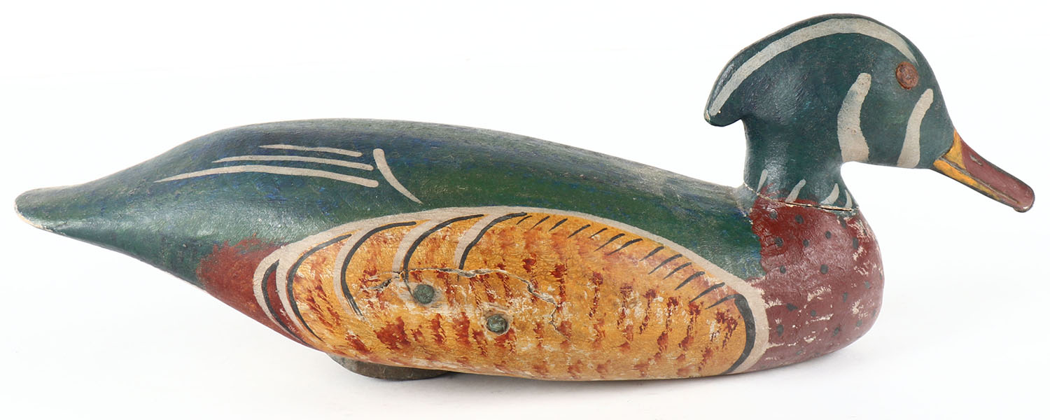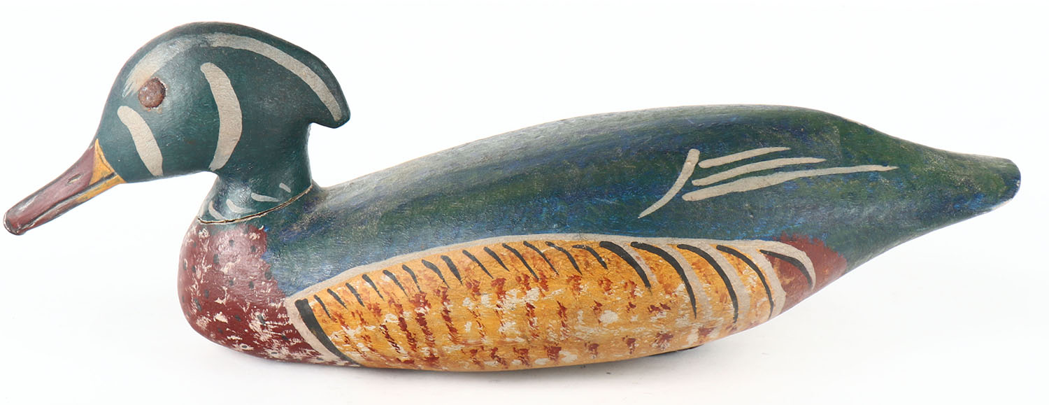Woodduck Drake by unknown maker, TE, solid wood, original paint, structurally excellent, 13'' OAL. Grade: Excellent - Value: 20 to 60