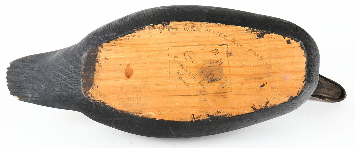 White Winged Scoter Drake by Gould, ME, glass eyes, solid wood, original paint, structurally excellent, signed on bottom, 14'' OAL. Grade: Excellent + - Value: 40 to 80