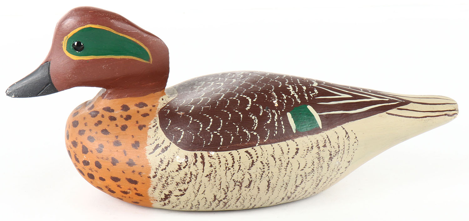 Greenwing Teal Drake by Jerry?????, glass eyes, solid wood, original paint, structurally excellent, signed on bottom, 10'' OAL. Grade: Excellent + - Value: 20 to 60