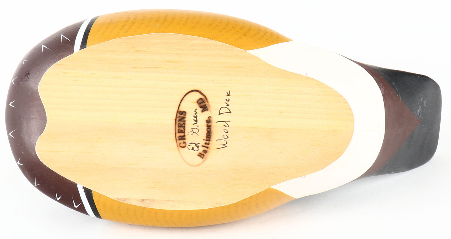 Woodduck Drake by Ed Green, Baltimore, MD, GE, solid wood, original paint, structurally excellent, 13'' OAL. Grade: MINT - Value: 30 to 60