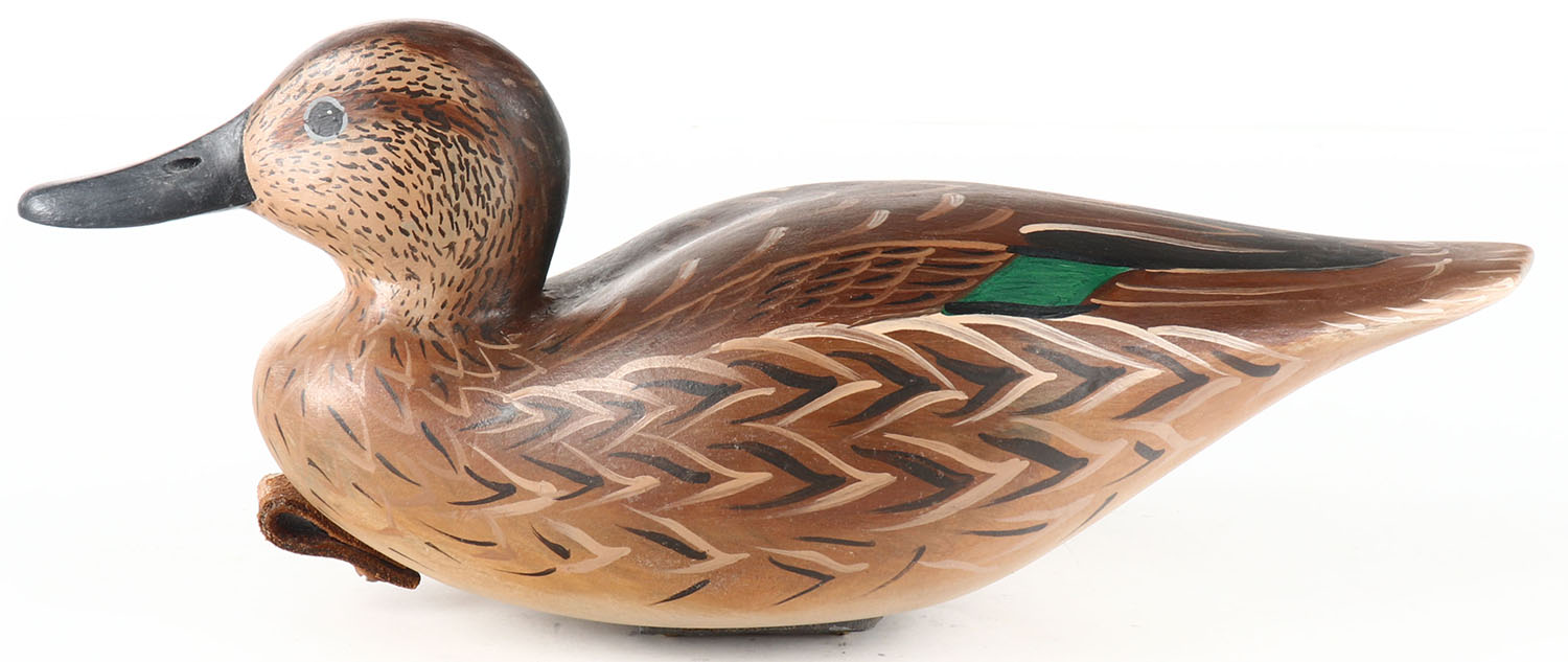 Greenwing Teal Hen by Rhodes, PE, solid wood, original paint, 13'' OAL, paired Drake is in lot 6171. Grade: Excellent ++ - Value: 30 to 60