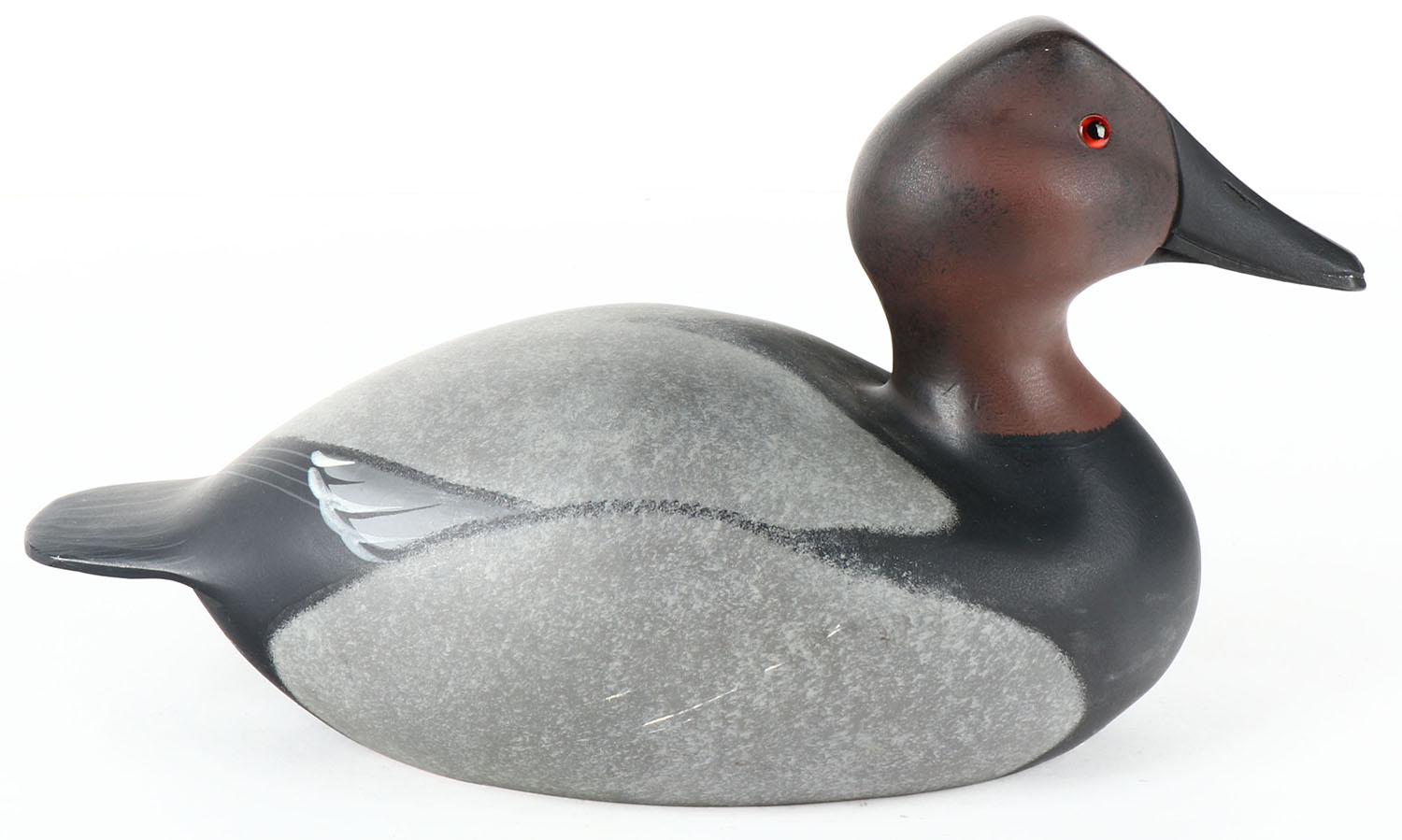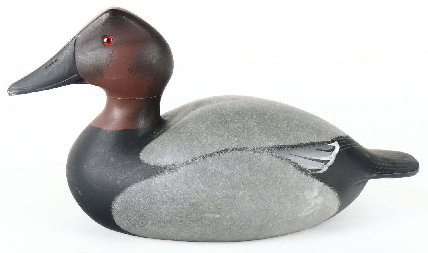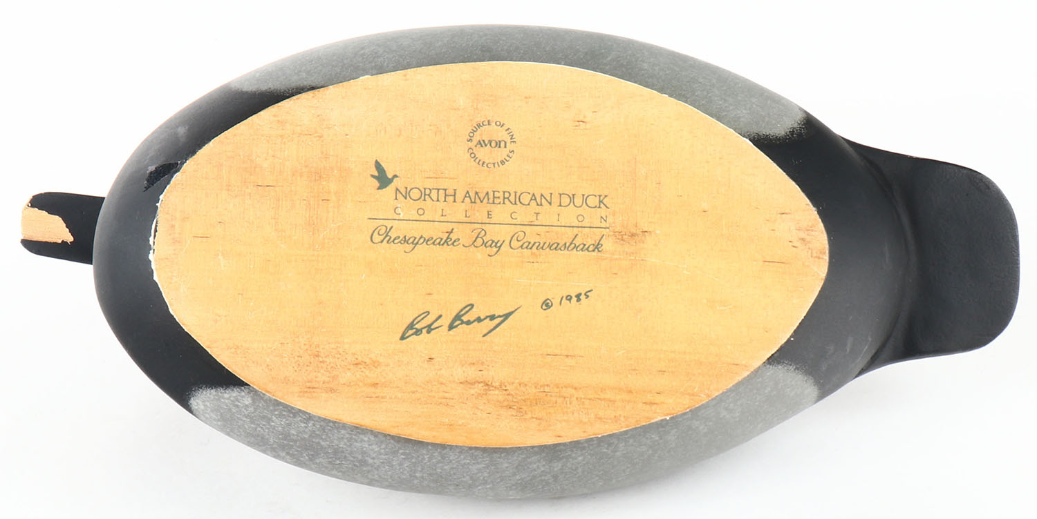 Canvasback Drake by BOB BERRY North American Duck Collection , Chesapeake Bay, Bob Berry, glass eyes, solid wood, original paint, hair line crack to neck & chip to tip of bill, signed and branded on bottom by NORTH AMERICAN DUCK COLLECTION BOB BERRY. Grade: Excellent - Value: 20 to 40