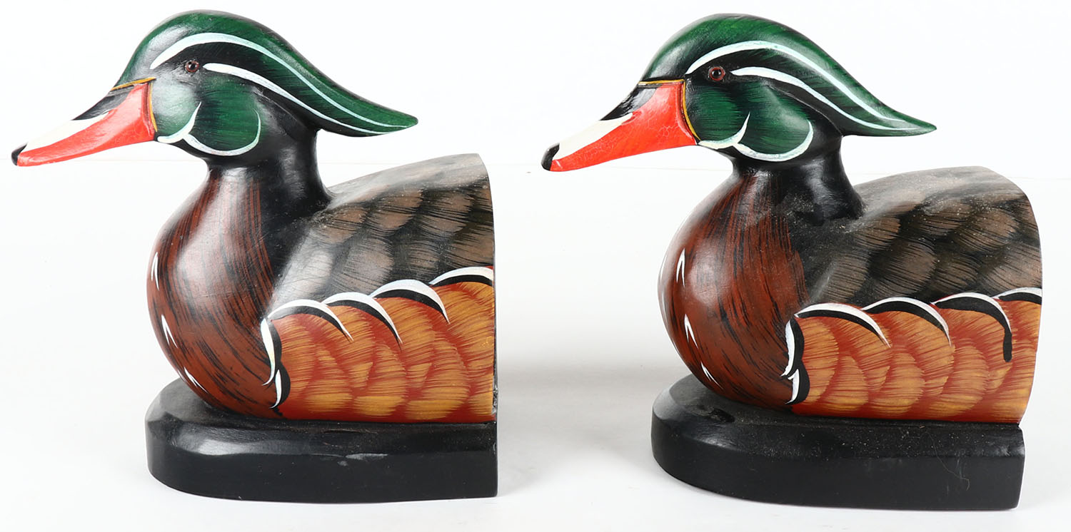 Woodduck Drake Book Ends by unknown maker, PE, solid wood, original paint, total they are 15 1/2'' wide put together. Grade: Excellent ++ - Value: 20 to 50
