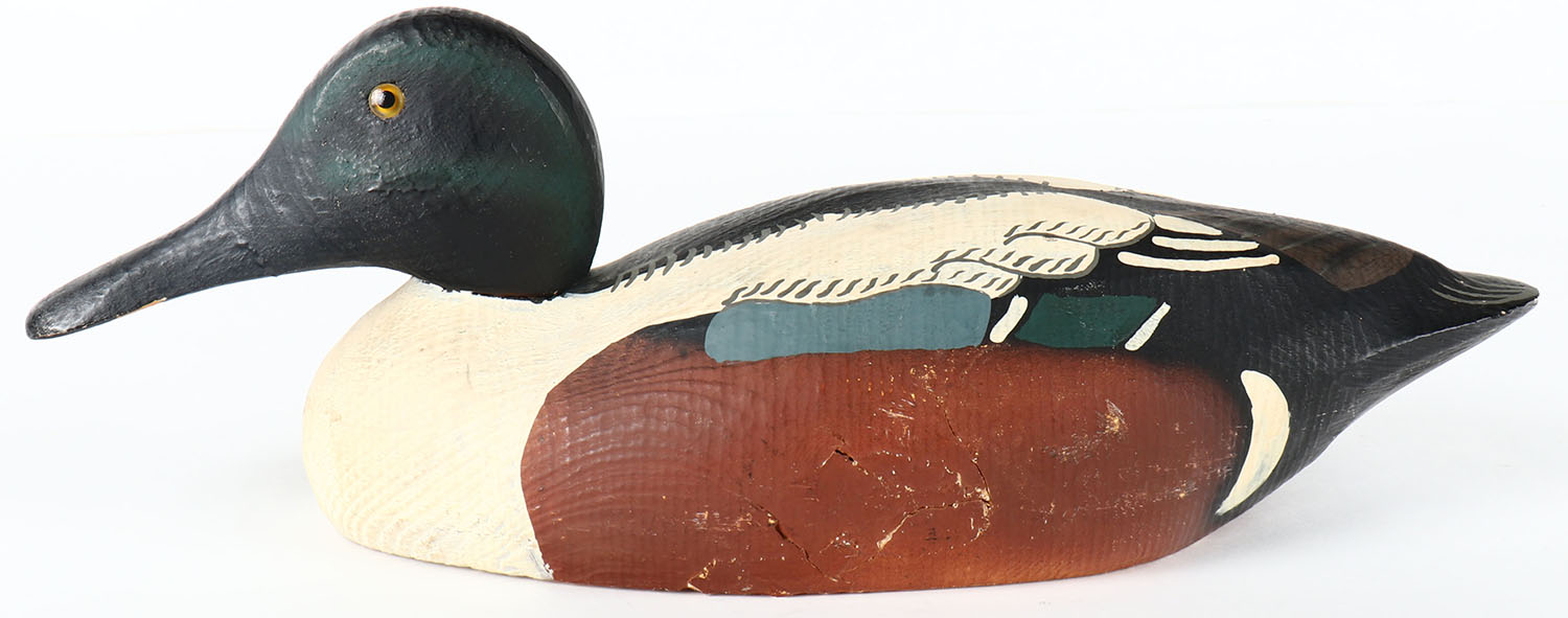Shoveler Drake by Herters Decoy Co., Waseca, MN, 1893 series, glass eyes, solid wood, original paint, structurally excellent, unmarked on bottom. Grade: Excellent ++ - Value: 70 to 225