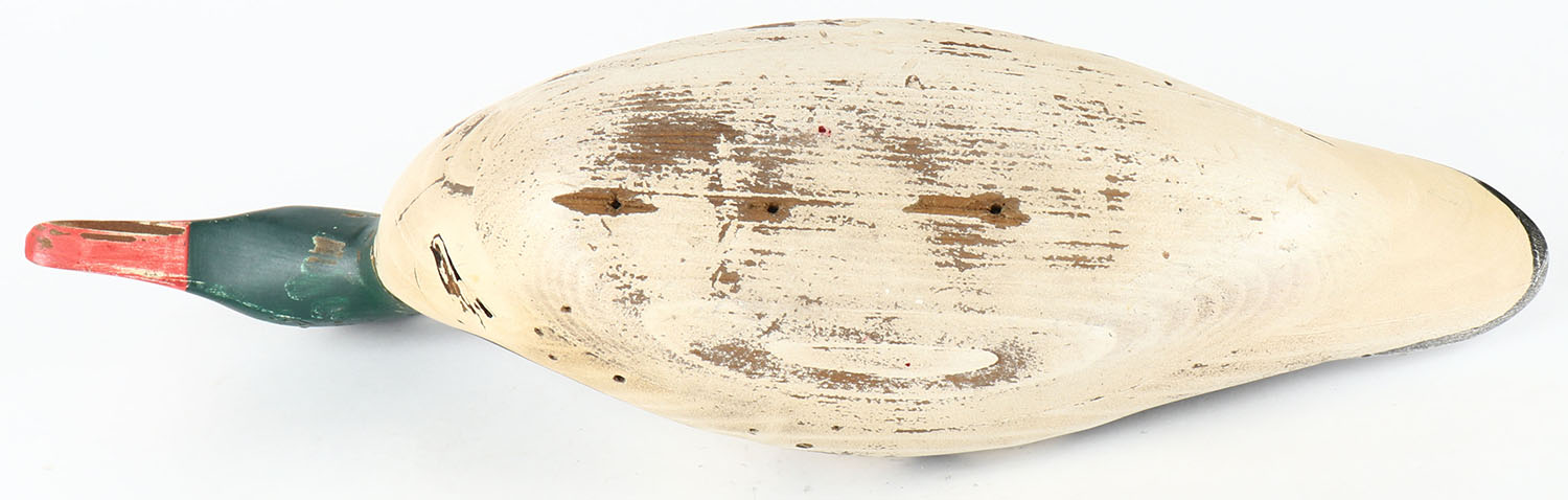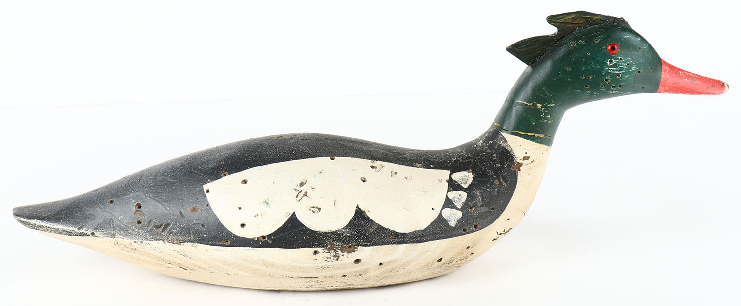 Swimming Hooded Merganser by unknown maker, GE, solid wood, original contemporary distressed paint, shows wear & bird shot, 20'' OAL. Grade: Very Good + - Value: 10 to 30