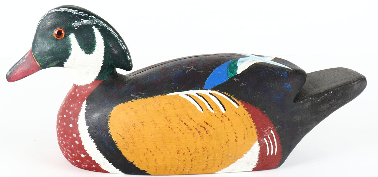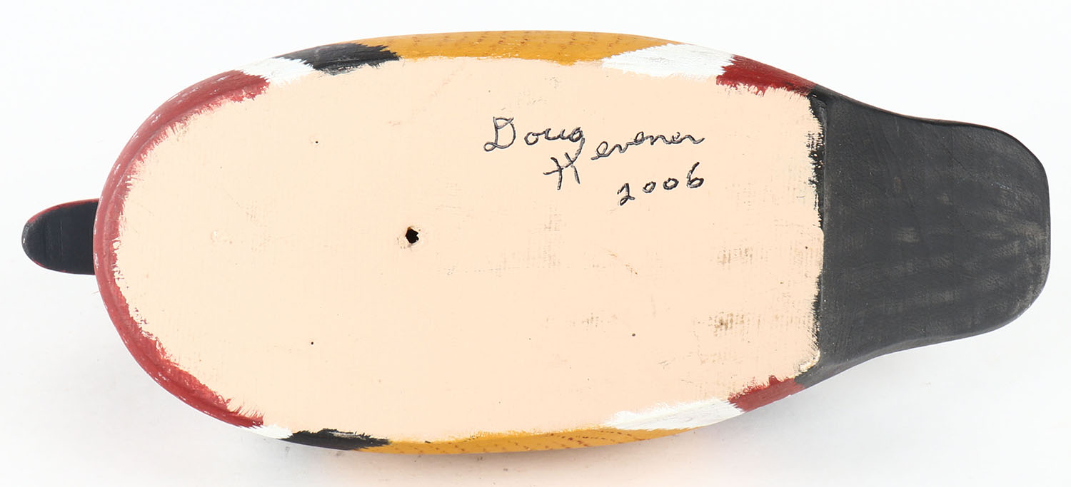 Woodduck Drake by Doug Hevener, GE, solid wood, original paint, 13'', OAL. Grade: Excellent - Value: 10 to 50