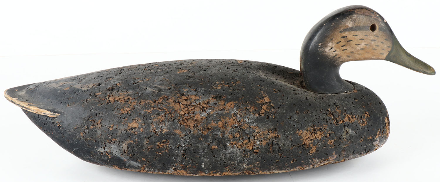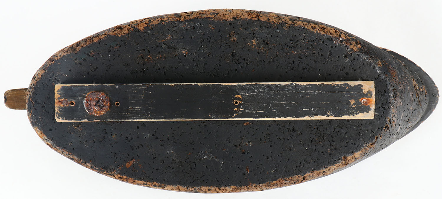 Black Duck by LL Bean, unmarked on keel, glass eyes, solid cork body, wood head, original paint, structurally excellent, 20'' OAL. Grade: Very Good ++ - Value: 20 to 40