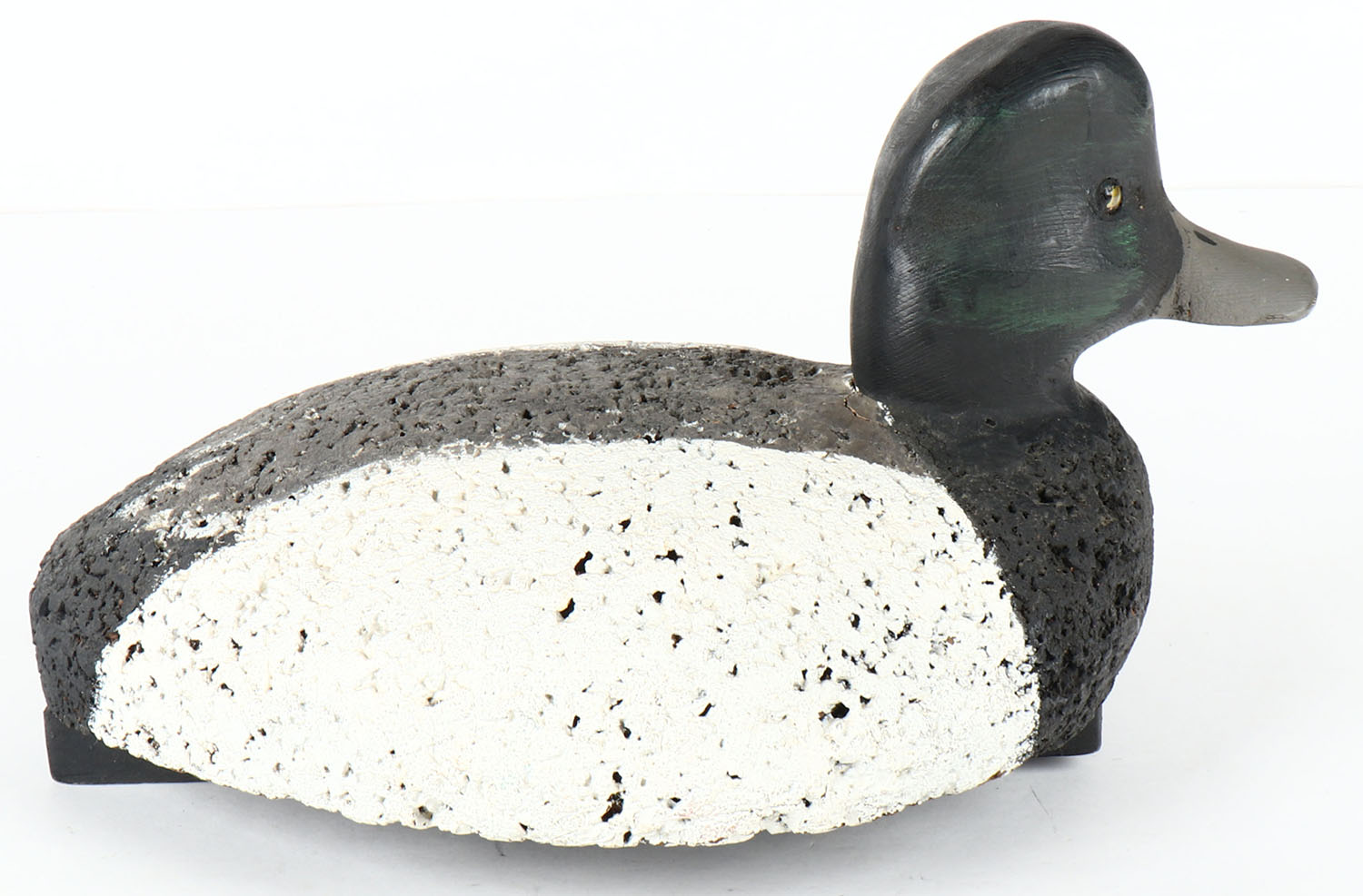 Bluebill Drake by Con G. (hard to read), glass eyes, solid cork body, wood head, original paint, structurally excellent, 13'' OAL. Grade: Excellent + - Value: 20 to 50