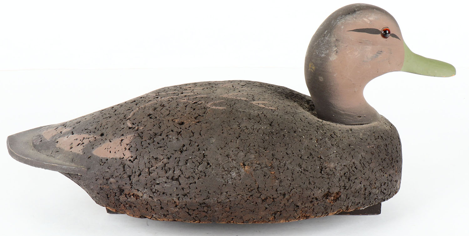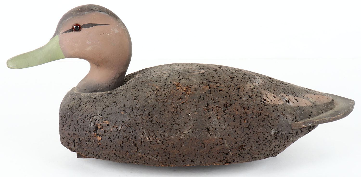Black Duck by unknown maker, glass eyes, solid cork body, wood head, original paint, structurally excellent, 16'' OAL. Grade: Excellent ++ - Value: 10 to 50