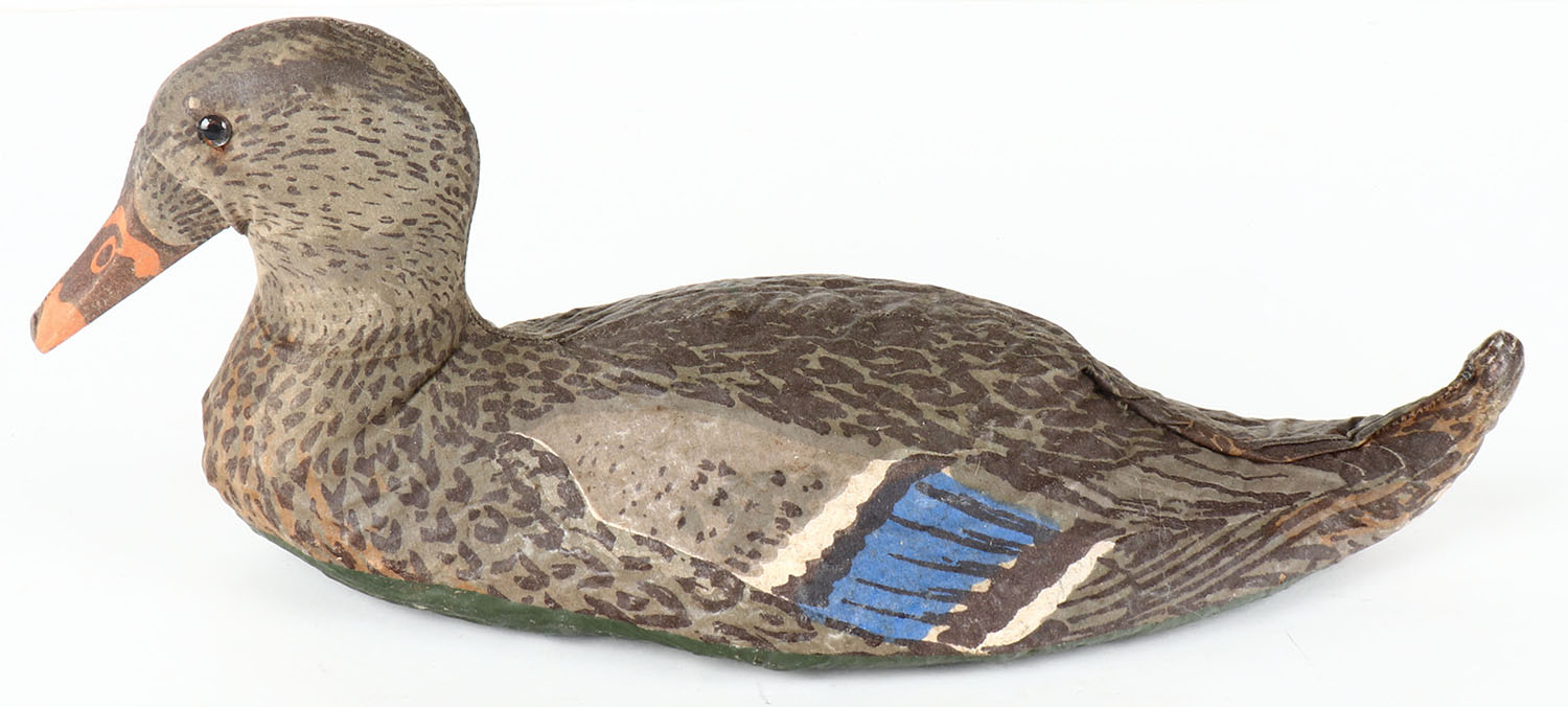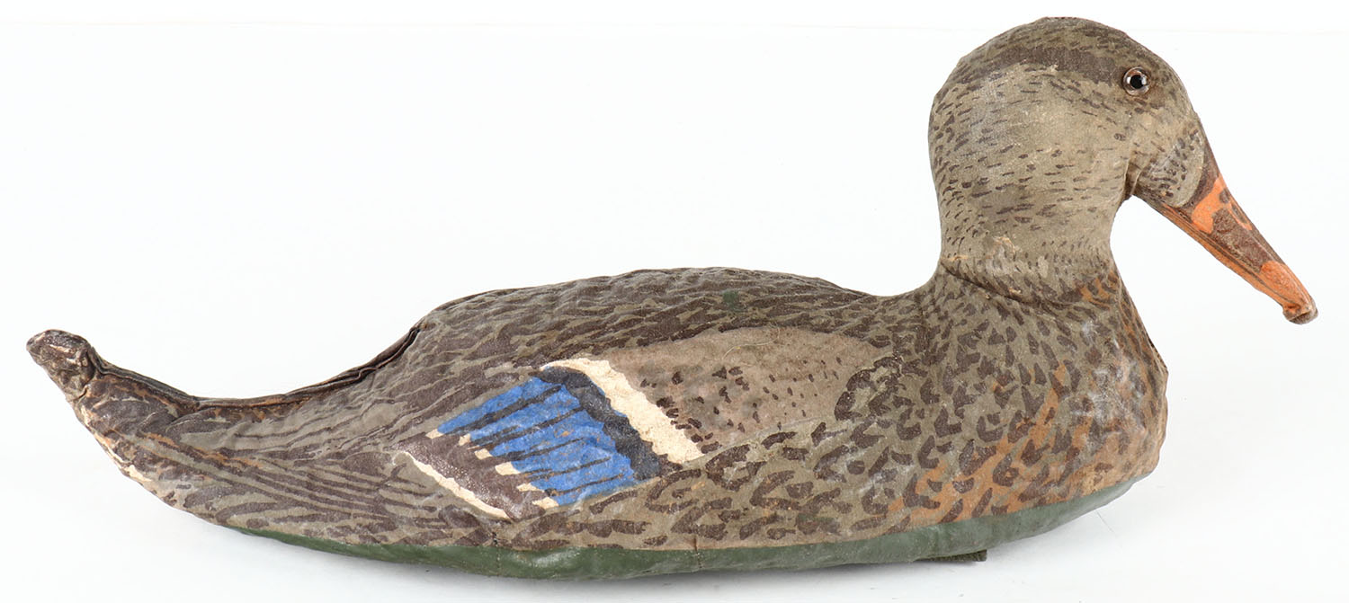 Mallard Hen by Oliveros Decoy Co., Houston, TX, glass eyes, canvas over cork, near mint original paint, structurally excellent. Grade: Excellent ++ - Value: 20 to 40
