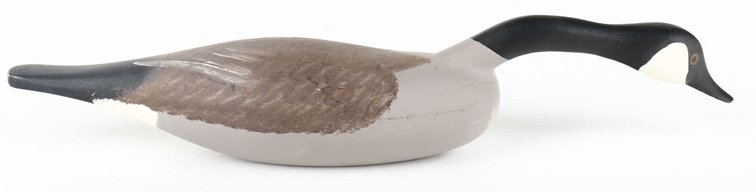 Miniature Swimming Canada Goose by S. Pierce, Havre de Grace, MD, PE, solid wood, mint original paint, signed on bottom, 11 1/2'' OAL. Grade: Excellent ++ - Value: 30 to 60