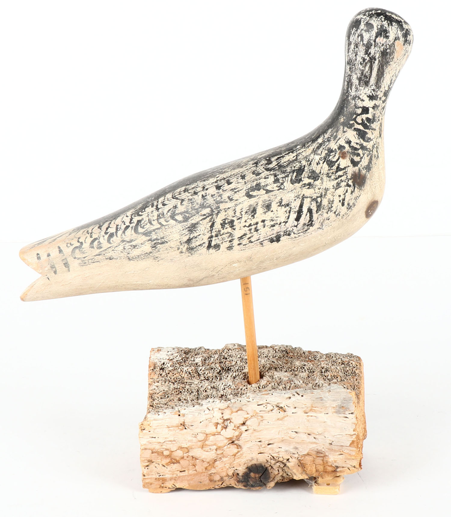 Shorebird by unknown carver on stand, no eyes, brocken bill, original paint, 10'' OAL. Grade: Very Good - Value: 10 to 60