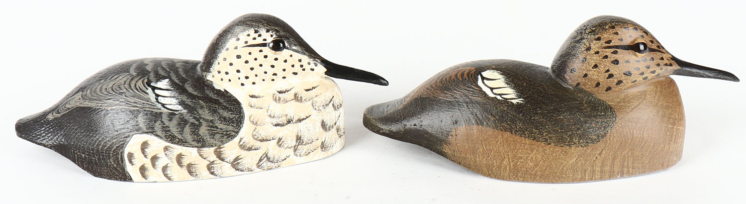 Pair of Shorebirds by Tom Martindale, Ontario, Canada, glass eyes, hollow wood, original paint, structurally excellent, branded TM & signed on bottom. Grade: MINT - Value: 20 to 80