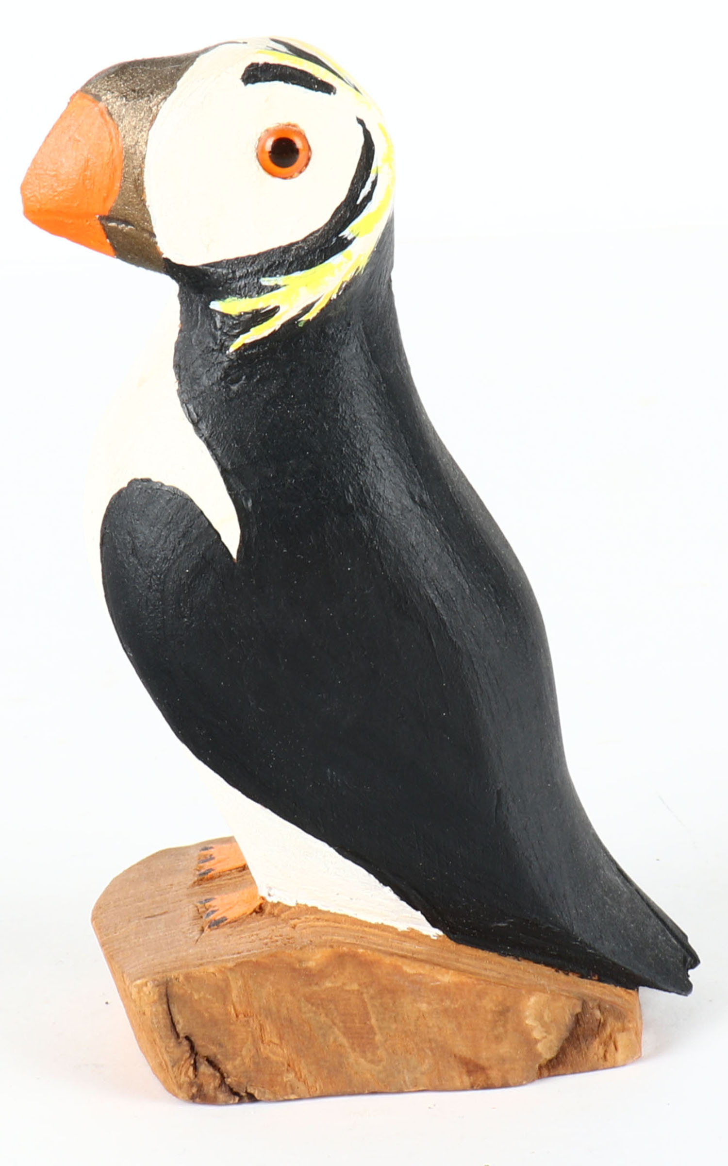 Puffin by Ed Moe Willow, AK, GE, solid wood, mint original paint on stand, 5'' tall. Grade: MINT - Value: 10 to 50
