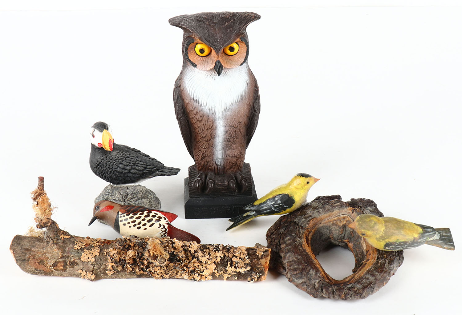 Lot of small birds, the owl is plastic and the rest are wood or ceramic. Grade: Excellent - Value: 10 to 100