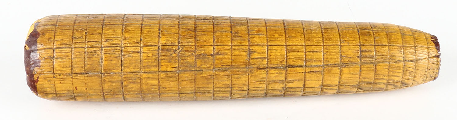 Corn Cob Decoy, wood, hand painted, etched, 8'' long. Grade: Excellent - Value: 6 to 30