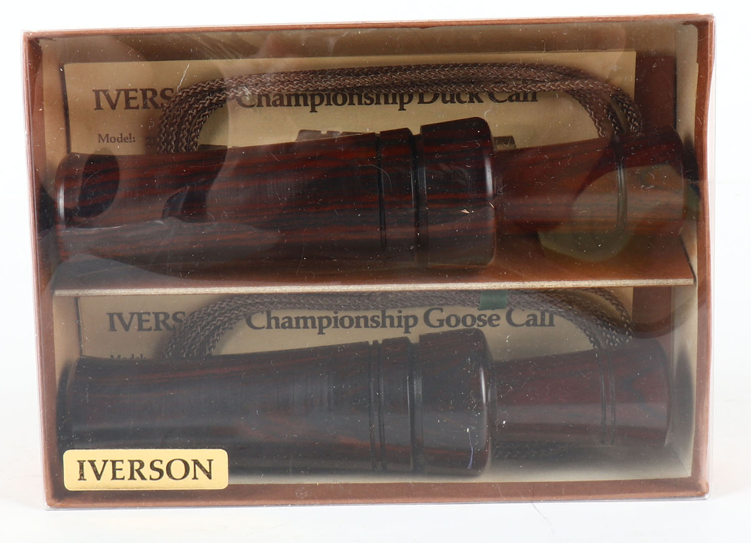 Iverson Duck and Goose call matched set in original box, , has paper work, lanyards, Rosewood barrels & stoppers, sound great. Grade: Excellent ++ - Value: 100 to 400