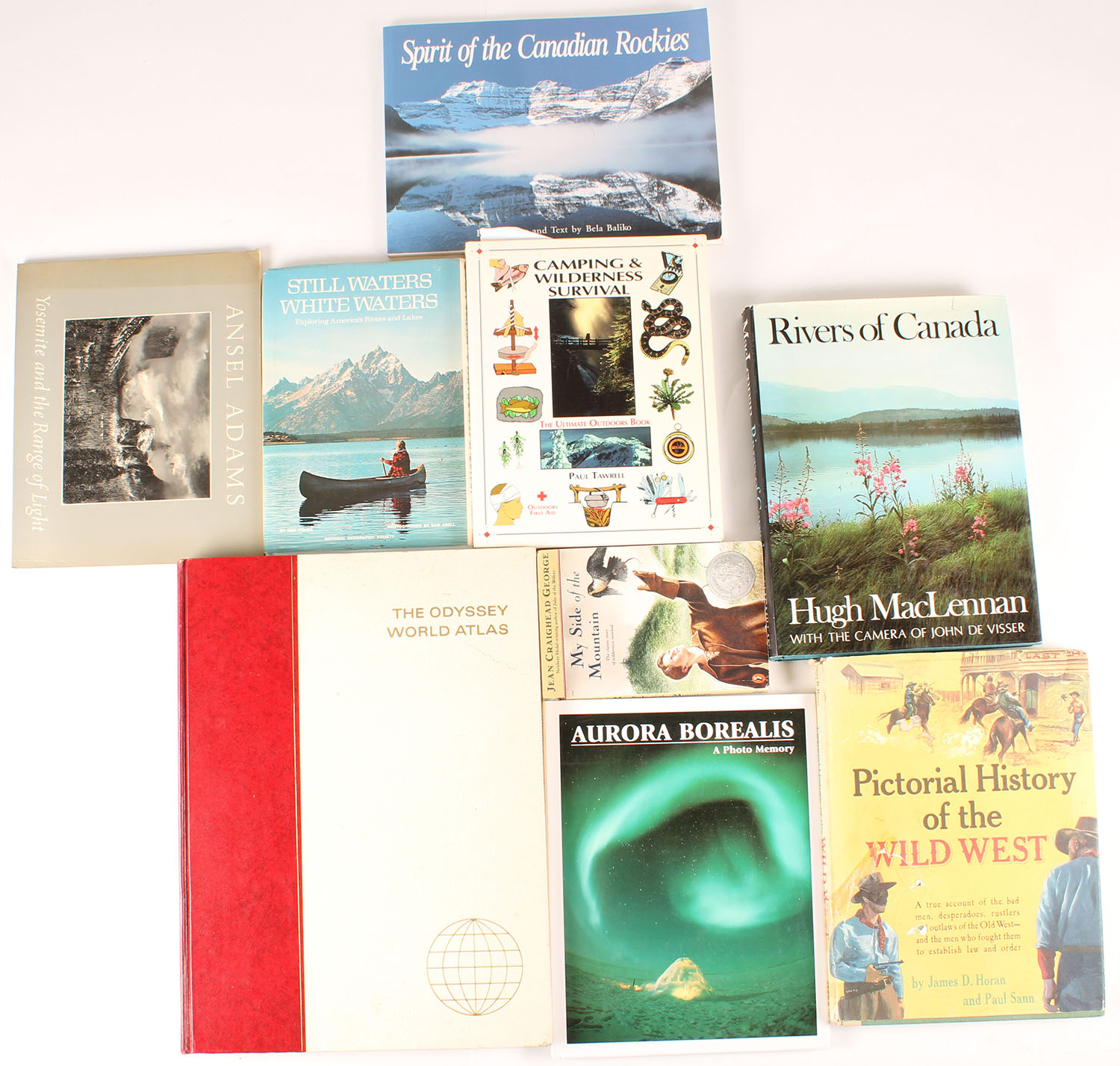 Large lot of books, My side of the Mountain, Aurora Borealis, Rivers of Canada, Camping & Wilderness Survival, Yosemite and the range of light, Spirit of the Canadian Rockies, still waters White Waters, pictorial history of the Wild West and 1966 World atlas. Grade: Very Good ++ - Value: 10 to 80
