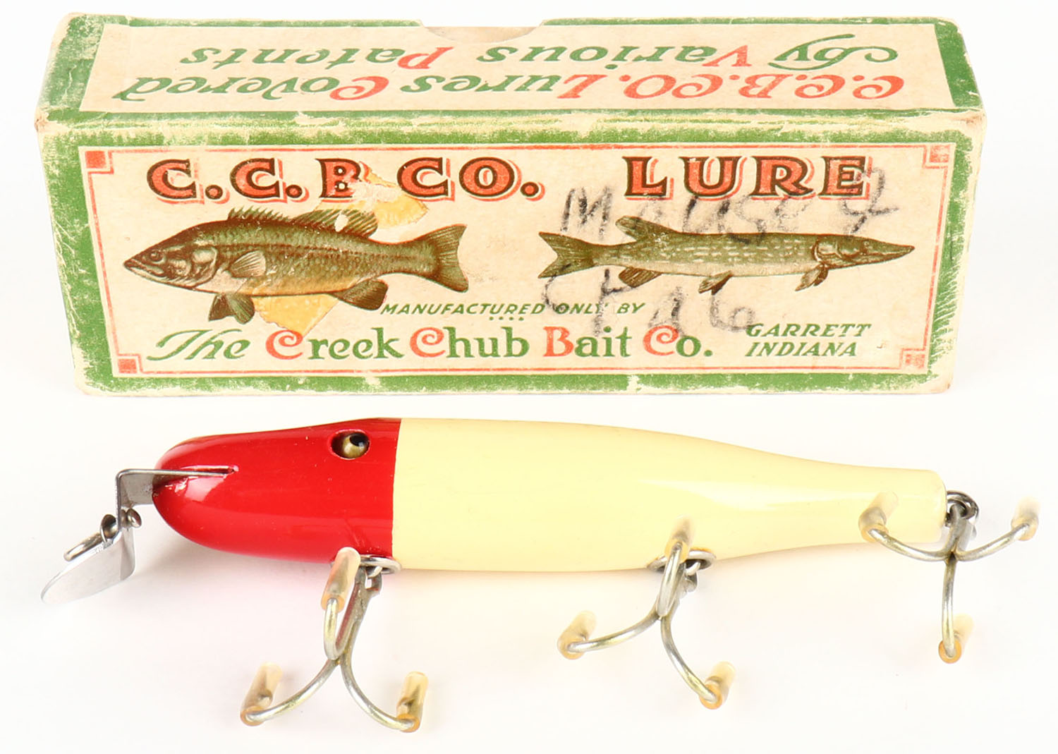 Boxes Creek Chub Pikie, red & white, wood lure, GE, 3 hooks, marked lip & back, Cup rig, 4 7/8''. Grade: Excellent ++ - Value: 10 to 50