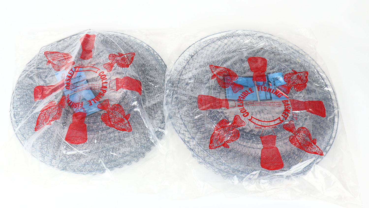 Lot of 2 brand new collapsible fish holding baskets in the original plastic warping, circa 1990's. Grade: MINT - Value: 10 to 30