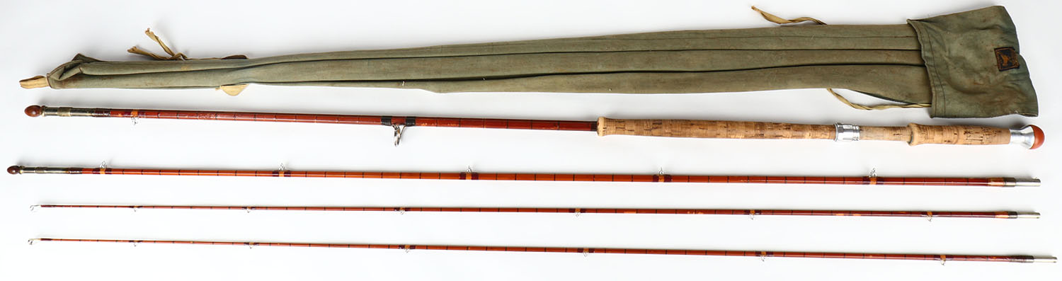 Rare Hardy Palakona, Bamboo Fly Rod, SN: E76245, 13', 10wt?, 3/2, rod is very nice with wonderful wraps, cork is very nice with some use, has wood caps in ferrules, has Hardy marked metal wrench in small pocket of bag, marked cloth bag, Very Rare rod in wonderful condition. Grade: Excellent - Value: 200 to 600
