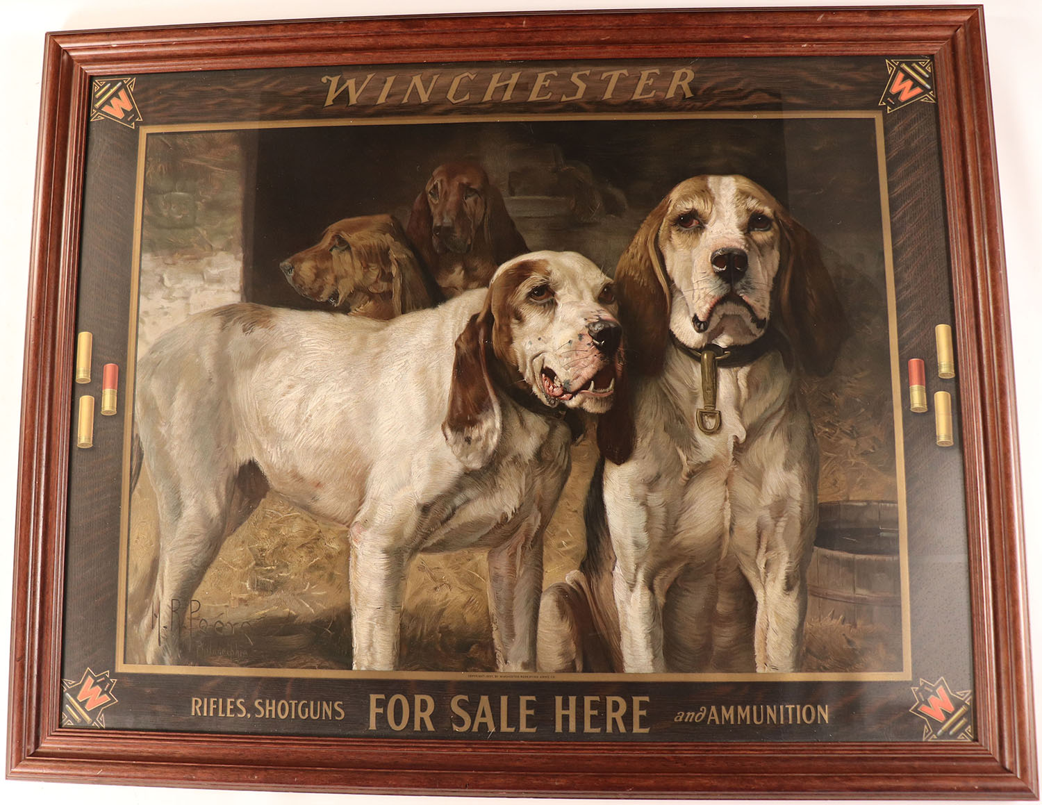 Extremely Rare Winchester BEAR DOGS poster by H.R. Poore, this image was contracted by Oliver Winchester of his Bear Dogs, this poster has absolutely fantastic colors throughout, the boarders have full color images of shotshells & red ''W'' in corners, the center dog image is very light & bright, 41 3/4'' x 32 1/2'', Circa late 1920's, this was also made with a wood boarder with decals of shot shells on the wood but due to shipping expense & damage during shipping they then produced this poster, framed, THIS IS EXTREMELY RARE, ESPECIALLY IN THIS CONDITION! THIS IS THE FIRST ONE WE HAVE OFFERED! Grade: Excellent ++ - Value: 5000 to 10000