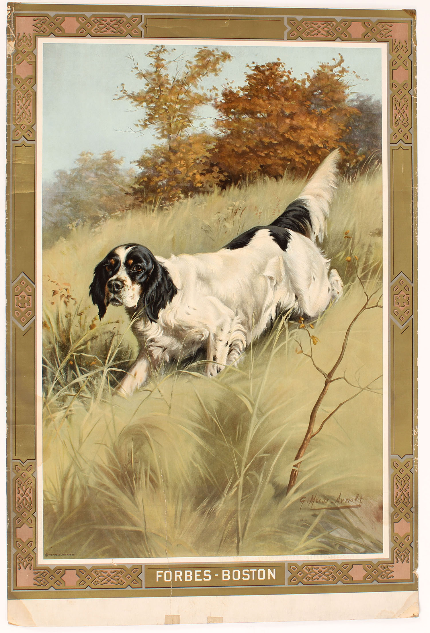 G. Muss Arnolt poster, pictures English Setter on point, has great colors with some edge wear & a tear to bottom, 20'' x 29'', no bands. Grade: Very Good + - Value: 50 to 200
