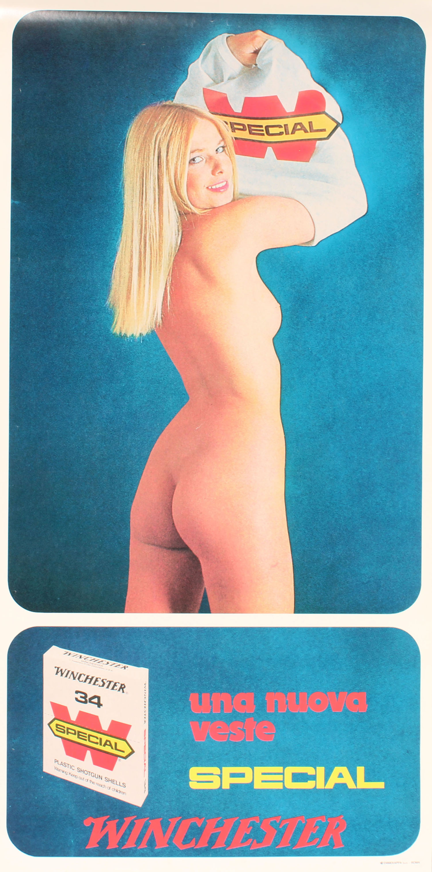 Winchester Special Poster, pictures a lady putting on a t-shirt, use in Italy for advertisement, 13 1/4'' x 27''. Highly sought after poster. Grade: Excellent ++ - Value: 100 to 300