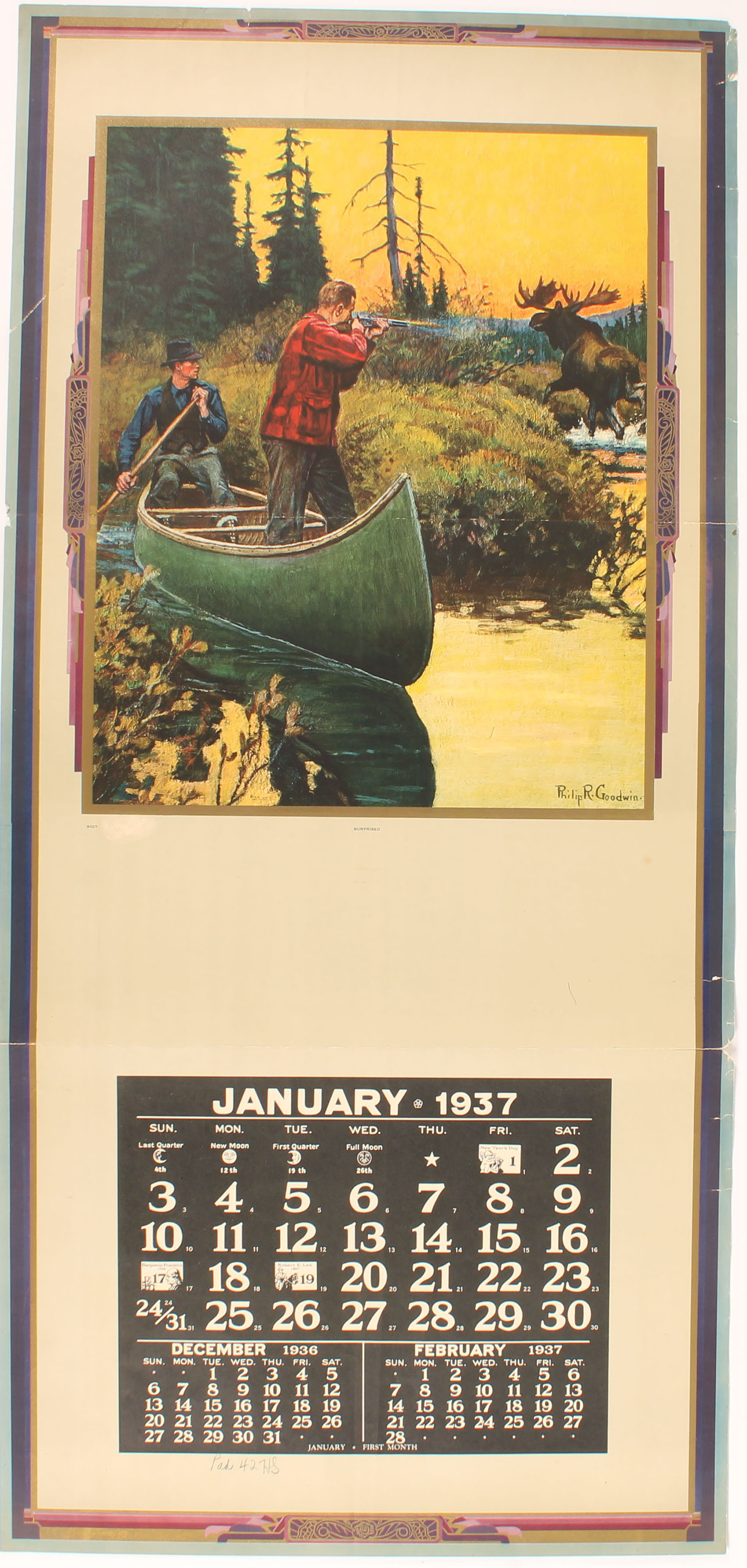 1937 Large Philip R. Goodwin calendar, pictures moose hunting scene, 21'' x 45'', no band. Grade: Excellent - Value: 50 to 250