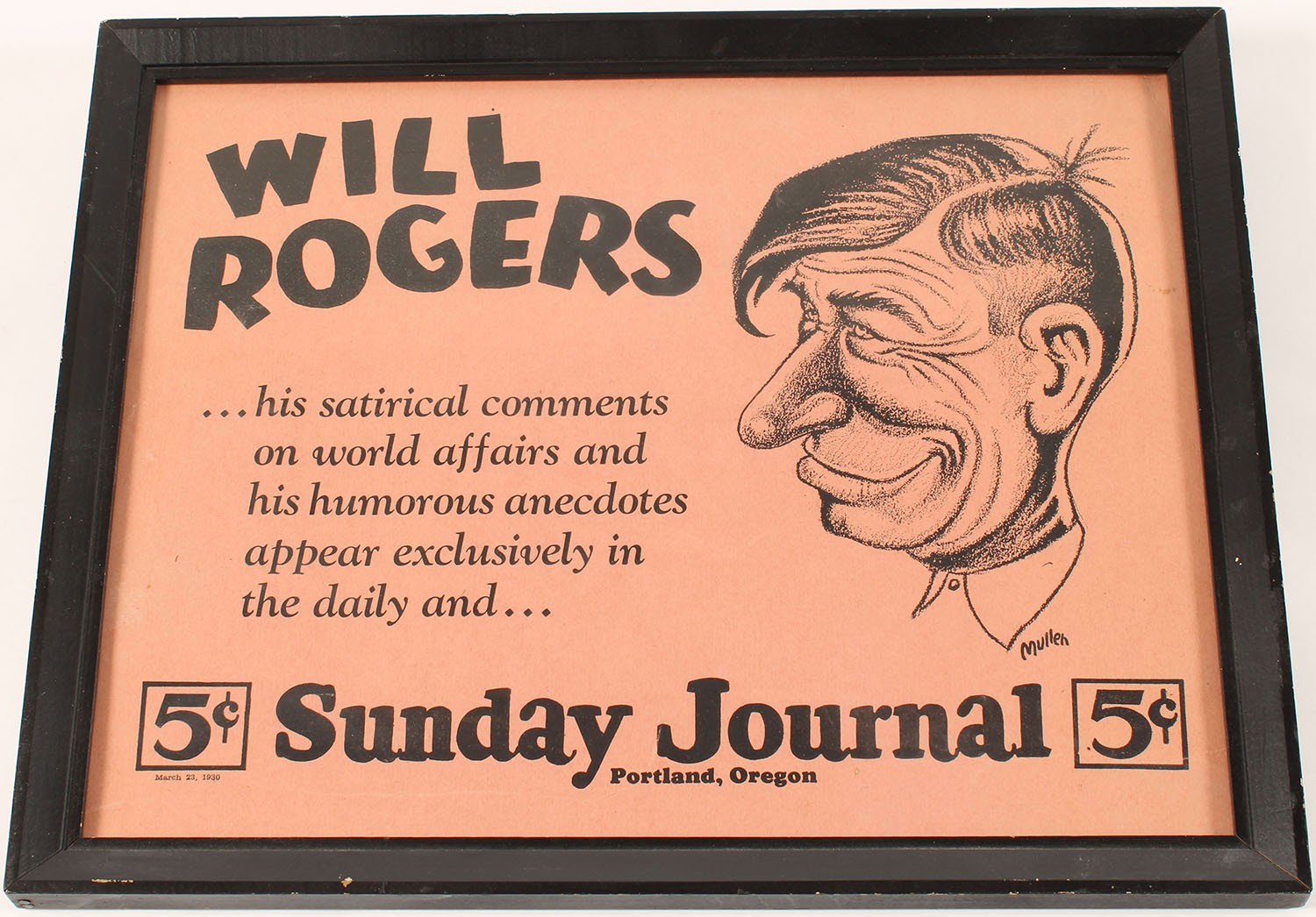 WILL ROGERS adv. For Sunday Journal Portland OR, framed. Grade: Excellent - Value: 2 to 30