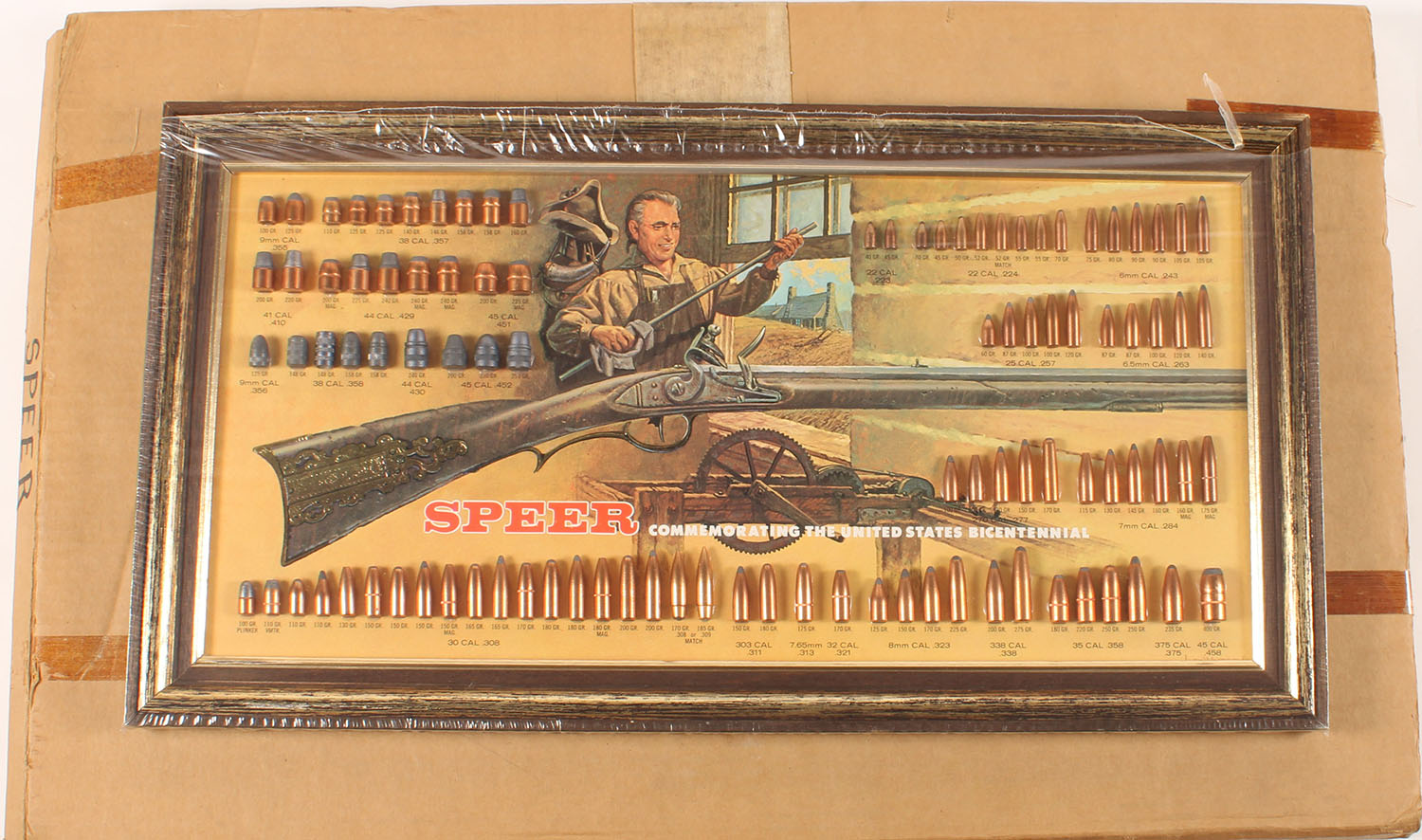 Speer Bullet Board, pictures Pennsylvania Kentucky Rifle being cleaned by frontiersman, all bullets intact, has original shipping box & still in original wrapping. Grade: MINT - Value: 100 to 300