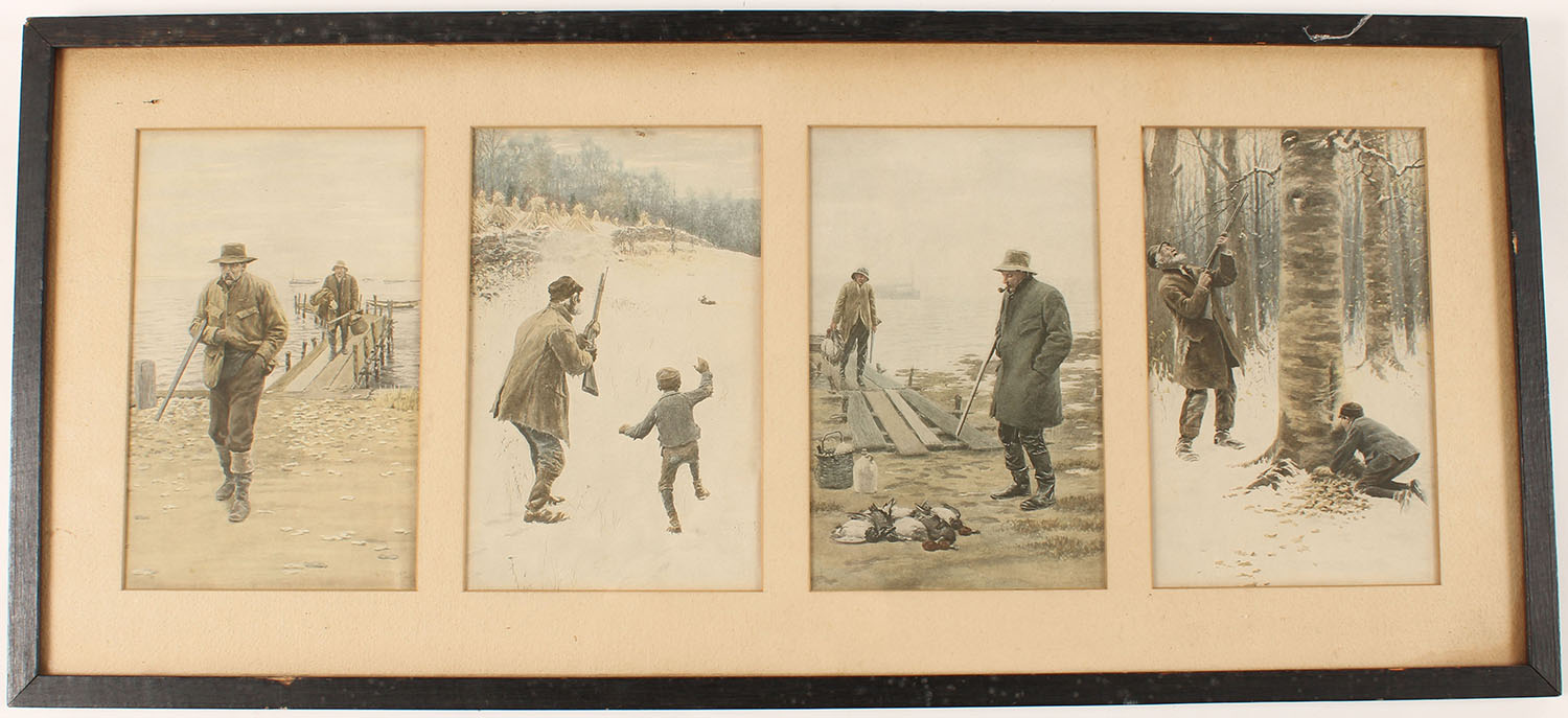 Set of 4 A.B. Frost prints in frame, all picture a hunting scene, all shows some age soiling, 25'' x 12'' frame size. Grade: Very Good - Value: 30 to 200