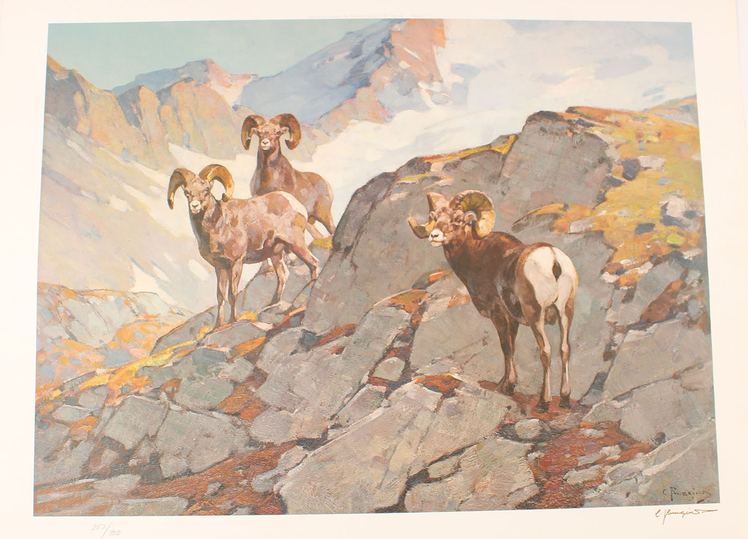 RARE Carl Rungius BIG HORN SHEEP print (American 1869-1959), art signed in gold, this is a L.E. 252/950. Measures 30.5'' X 24'', wonderful full color image of three big horn sheep on mountain. Grade: MINT - Value: 50 to 500