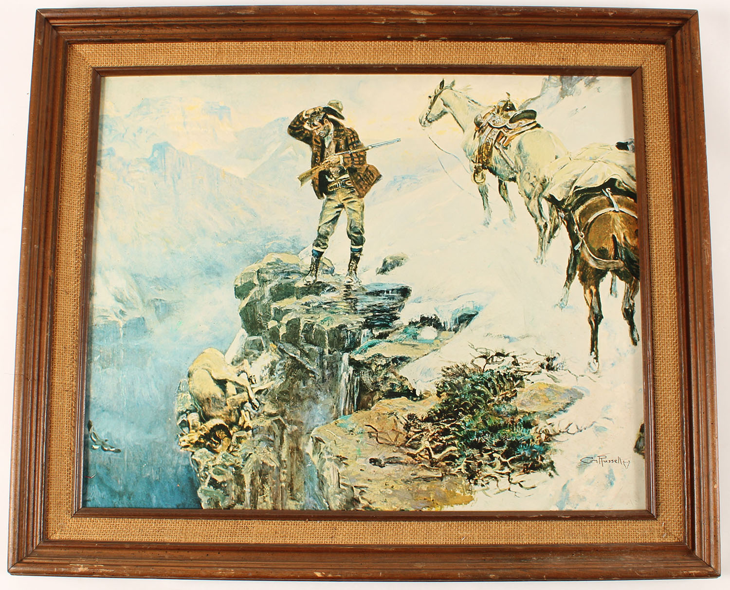 C.M. Russell print on cardboard, pictures hunter on horseback at the top of a high clif trying to get down, image size, 19'' x 16'', framed. Grade: Excellent - Value: 10 to 80