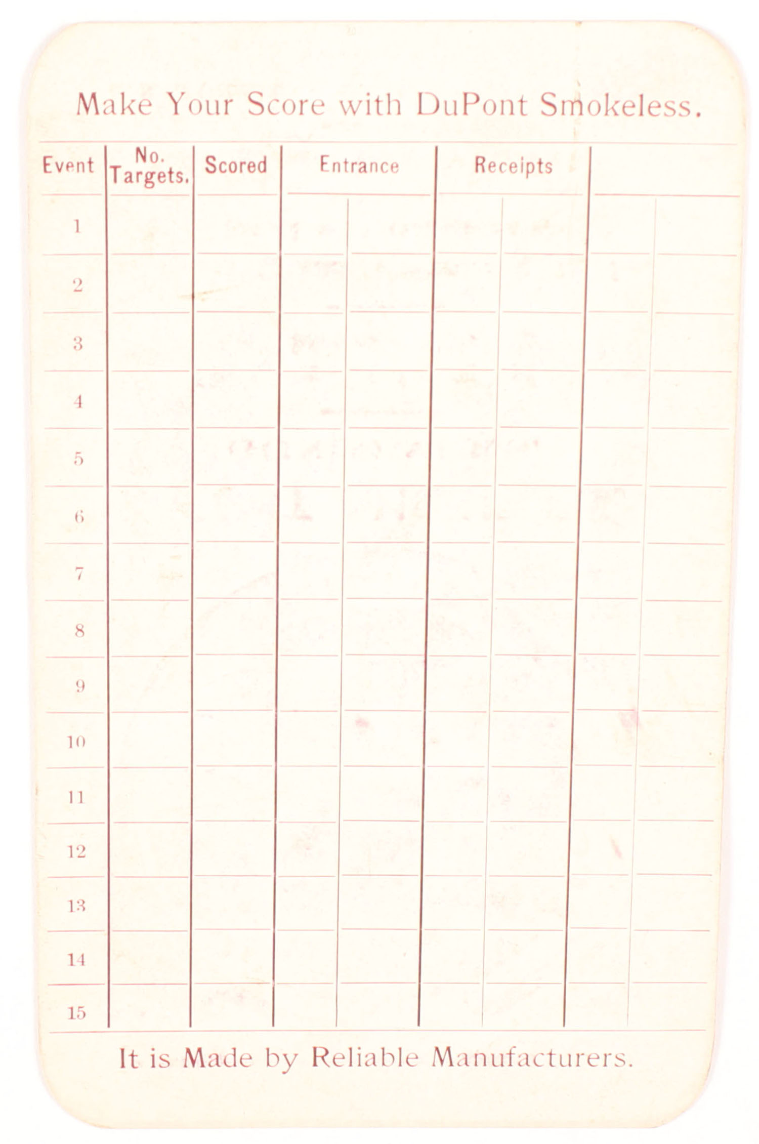 1893 E.I. DuPont de Nemours & Co. Score Card, unused, has image of powder can logo with two dogs, very nice condition, 3'' x 5 1/2''. Grade: Excellent - Value: 30 to 100