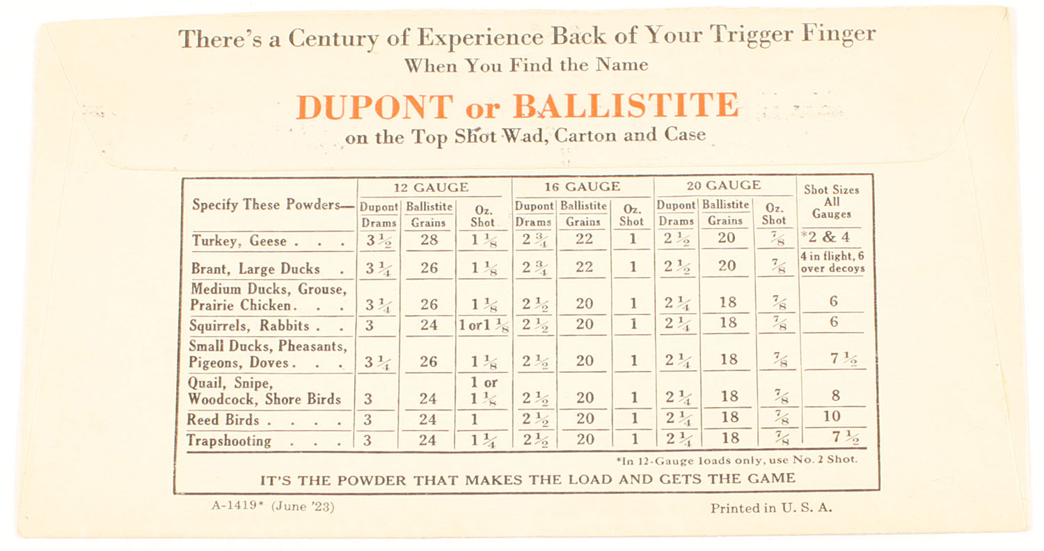 Dupont Powders Envelope, used dated 1923, full color image of MONORA 1910 Champion field trial dog, back has loading for all different kinds of shells. Grade: Very Good ++ - Value: 20 to 150