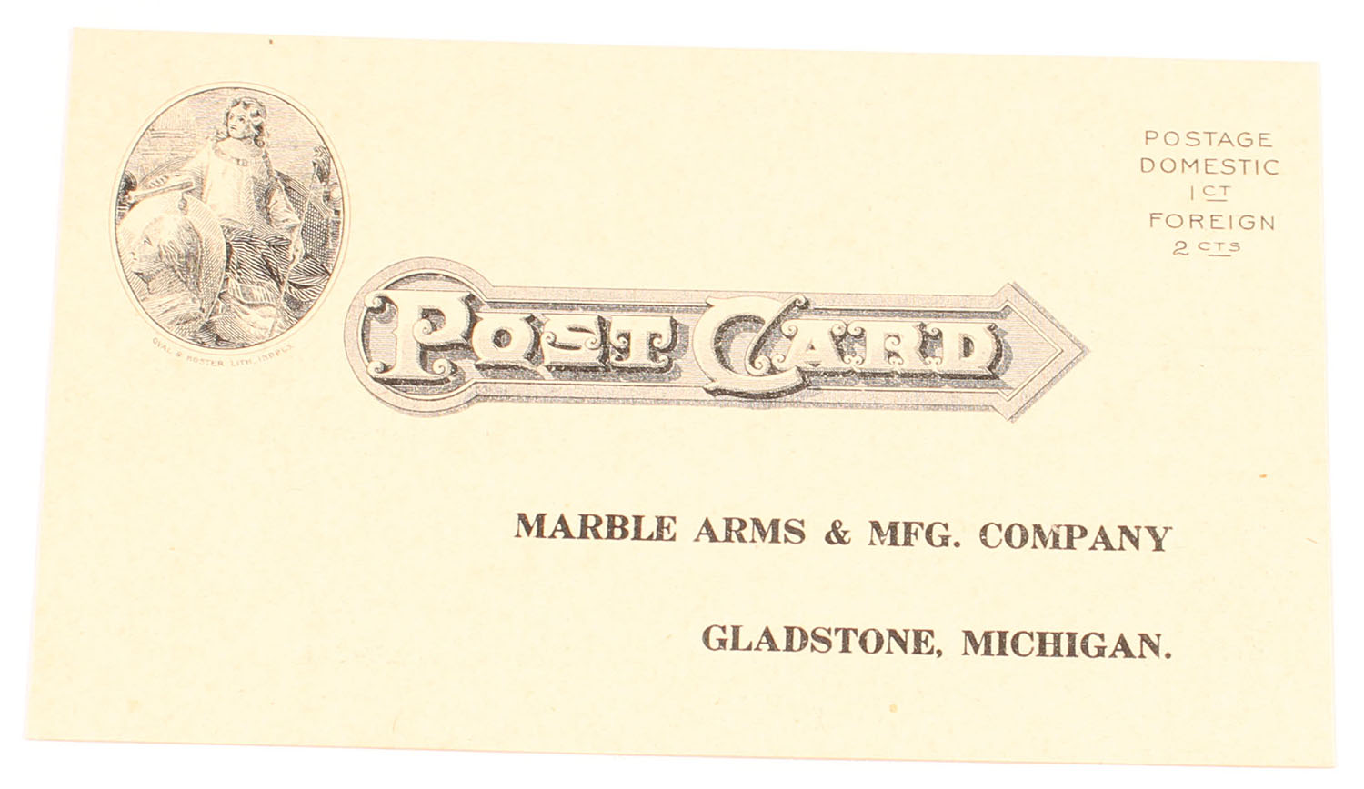 Marbles Arms & Mfg. Co. postcard, unused. Grade: Excellent ++ - Value: 10 to 50