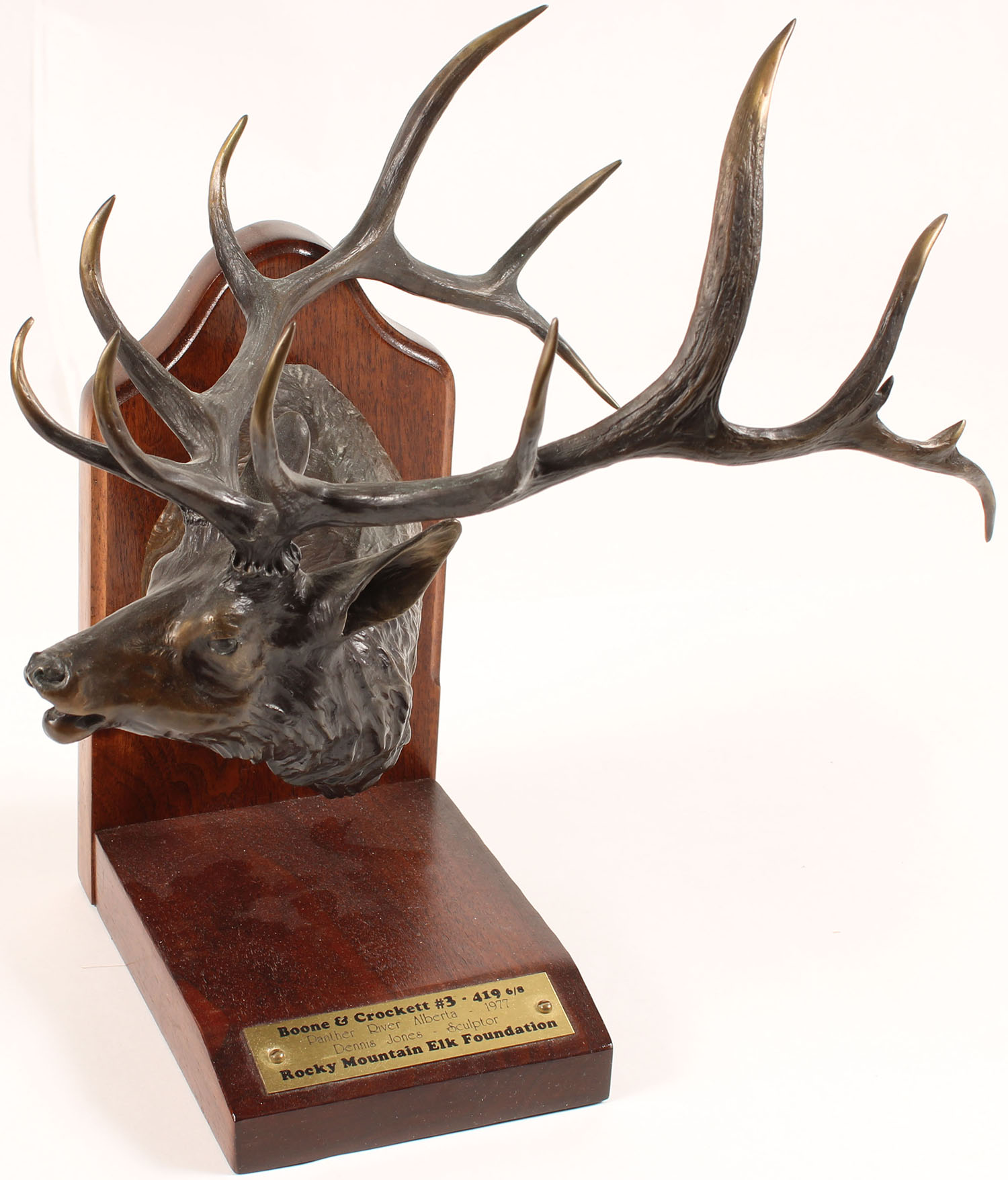 Boone & Crockett #3-419 6/8. Bronze Elk Head by Sculptor Dennis Jones. Rocky Mountain Elk Foundation. Panther River Alberta, 1977, Measure 14 inches tall to tip of antlers x 11 inches across x 10 inches deep. Grade: Excellent ++ - Value: 200 to 1000