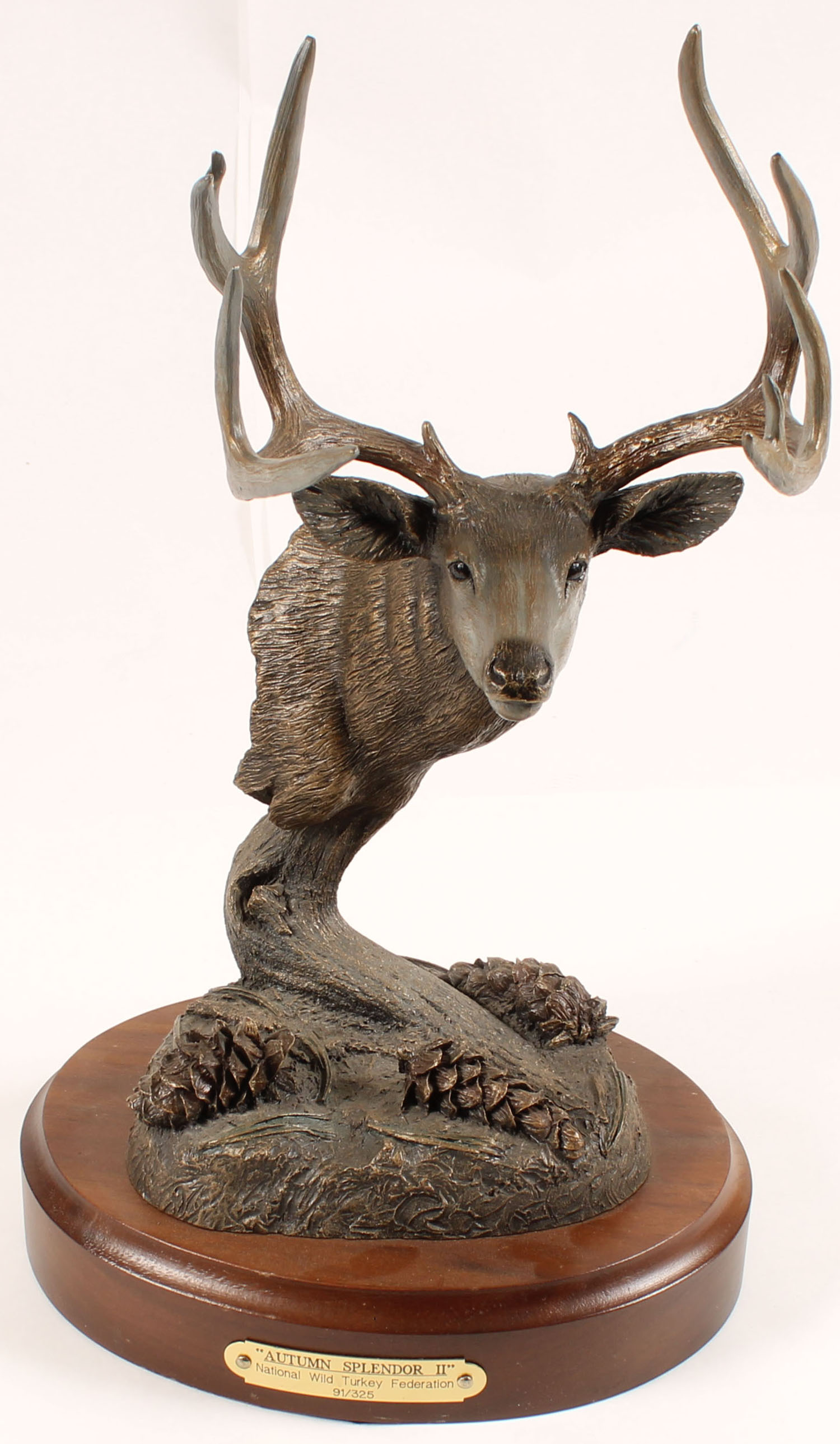 Mule Deer Bronze ''AUTUMN SPLENDOR II'', by Bradford Williams, National Wild Turkey Federation 91/325, has wood base, 8'' wide & 13'' tall. Grade: Excellent ++ - Value: 100 to 700