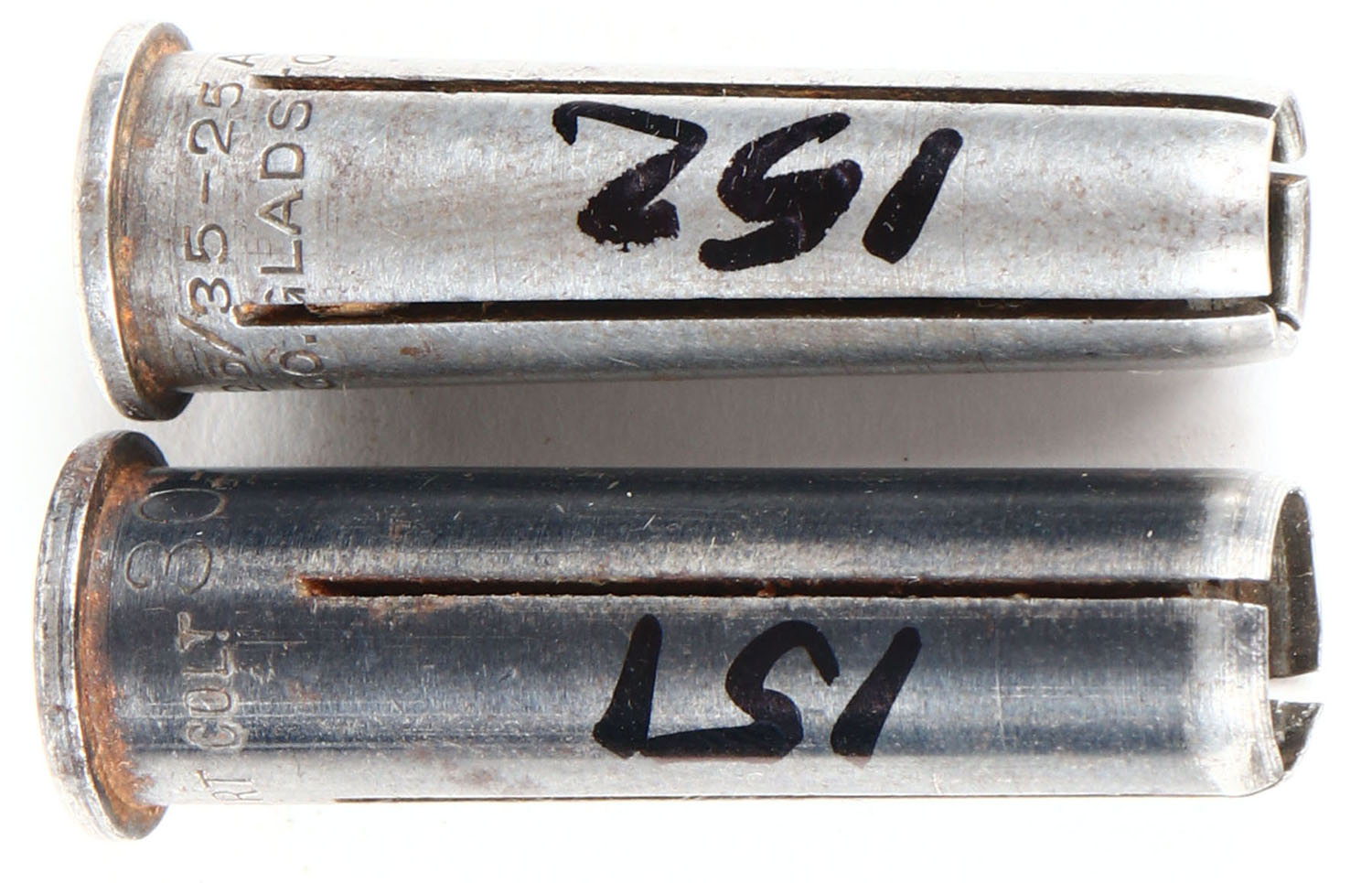 Lot of (2) Marbles Auxiliary carts, (1) No. 151 (.30-30 Win. - .32 Short Colt), (1) No. 152 (.25-35 Win. - .25 Auto.). Grade: Excellent - Value: 6 to 40