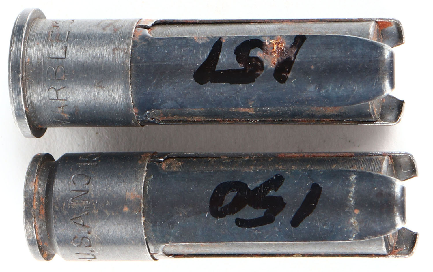 Lot of (2) Marbles Auxiliary carts, (1) No. 151 (.30-30 Win. - .32 Short Colt), (1) No. 150 (.25-35 Win. - .25 Auto.). Grade: Excellent - Value: 6 to 40