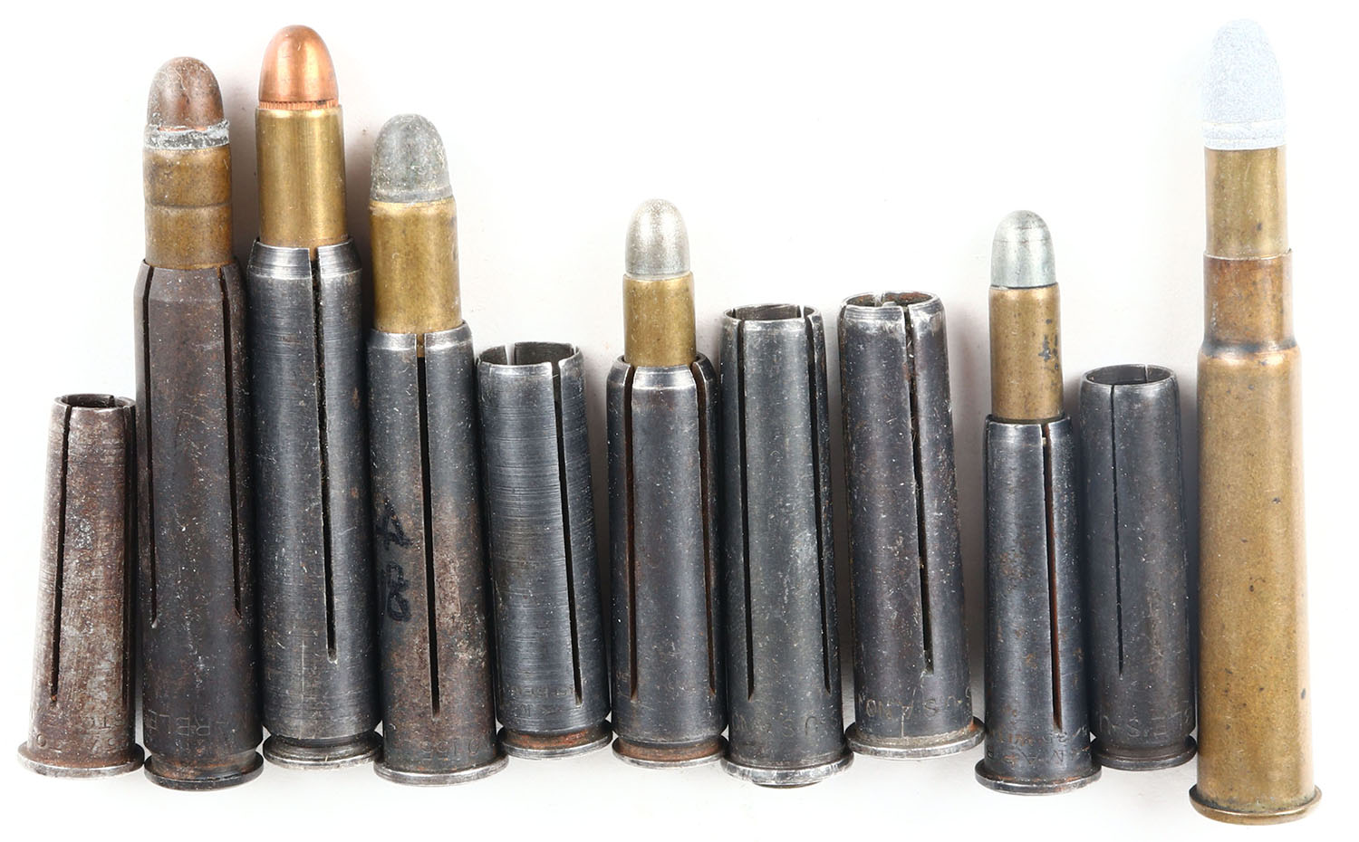 Lot of (10) Marbles Auxiliary Cartridges, (1) No. 167 (.35 Rem. - .380 Colt Auto.), (1) No. 164 (.32 Remington/.32 Colt Automatic), (1) No. 152 (.25-35 Win. - .25 Colt Auto.), (1) No. 170 (.250-3000 Savage - /25 Colt Auto.), (1) No. 165 (.303 British - .32 Smith & Wesson), (1) No. 162 (.30-03/.30-06 - .32 Smith & Wesson), (1) No. 155 (.30-40 Krag - .32 Smith & Wesson), (1) No. 157 (.30-40 Krag - .32 Colt Auto.), (1) No. 159 (.30-03/.30-06 - .32 Colt Auto.), (1) No. 152 (.25-35 Win. - .25 Auto.), (1) .30-30 Winchester - .32 Auto (not marbles, unknown mfg.) Grade: Excellent - Value: 20 to 60