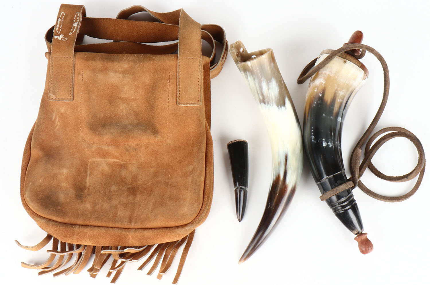 Set of 2 powder horns in leather sachel, both solid, unmarked. Grade: Excellent - Value: 20 to 60