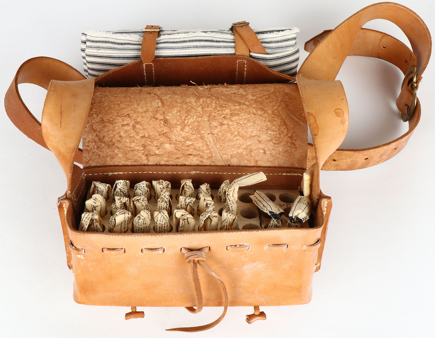 Leather sachel with towel and full of powder loads for flintlock or muzzleloader. Grade: Excellent ++ - Value: 20 to 60