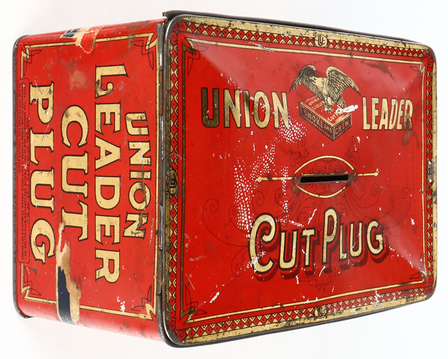 Large metal tobacco tin Empty, Union Leader. Grade: Very Good ++ - Value: 20 to 50