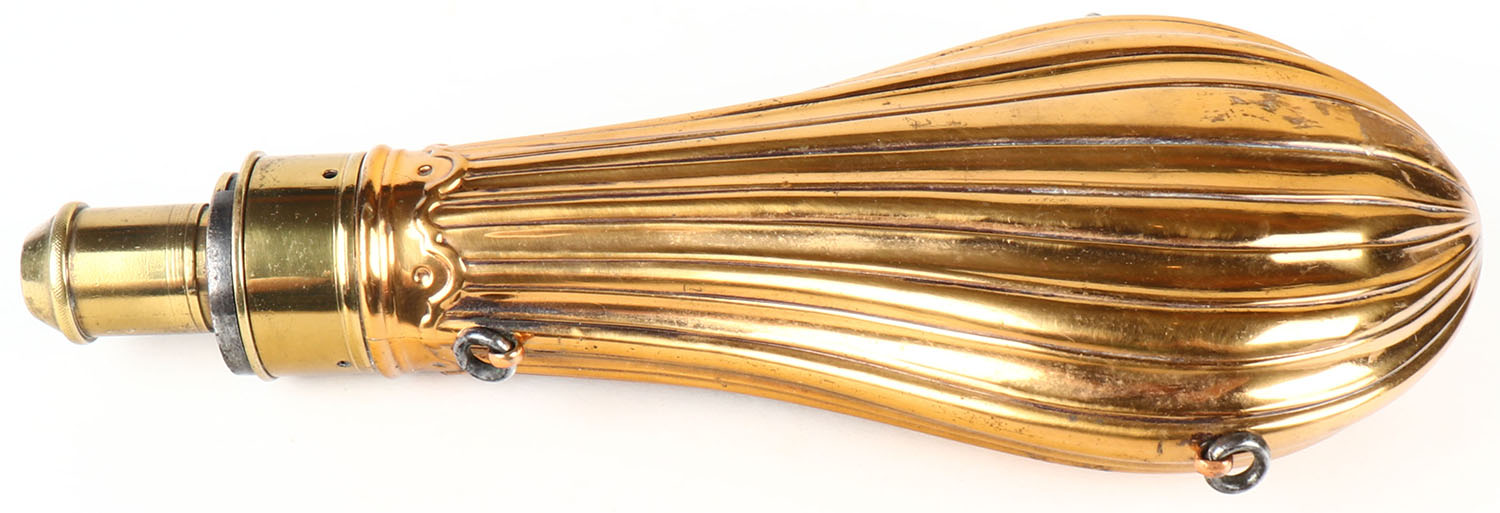 RARE! G & J W Hawksley Shefield brass powder flask, has age soiling. Grade: Excellent - Value: 50 to 100