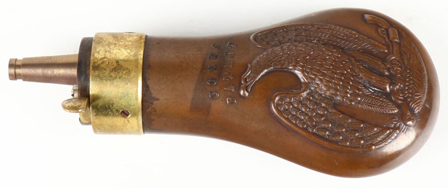 RARE! Colts Patent brass powder flask. Grade: Excellent ++ - Value: 50 to 150