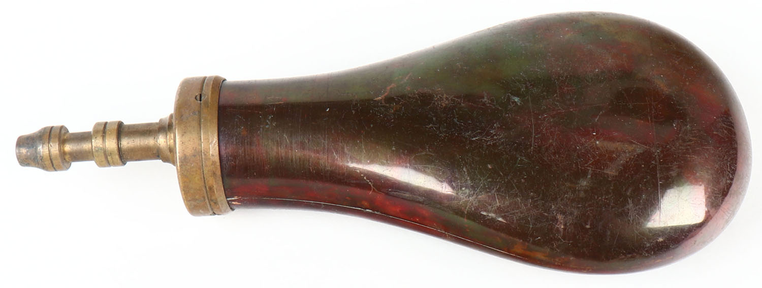 Brass powder flask, has some age soiling. Grade: Excellent - Value: 20 to 60