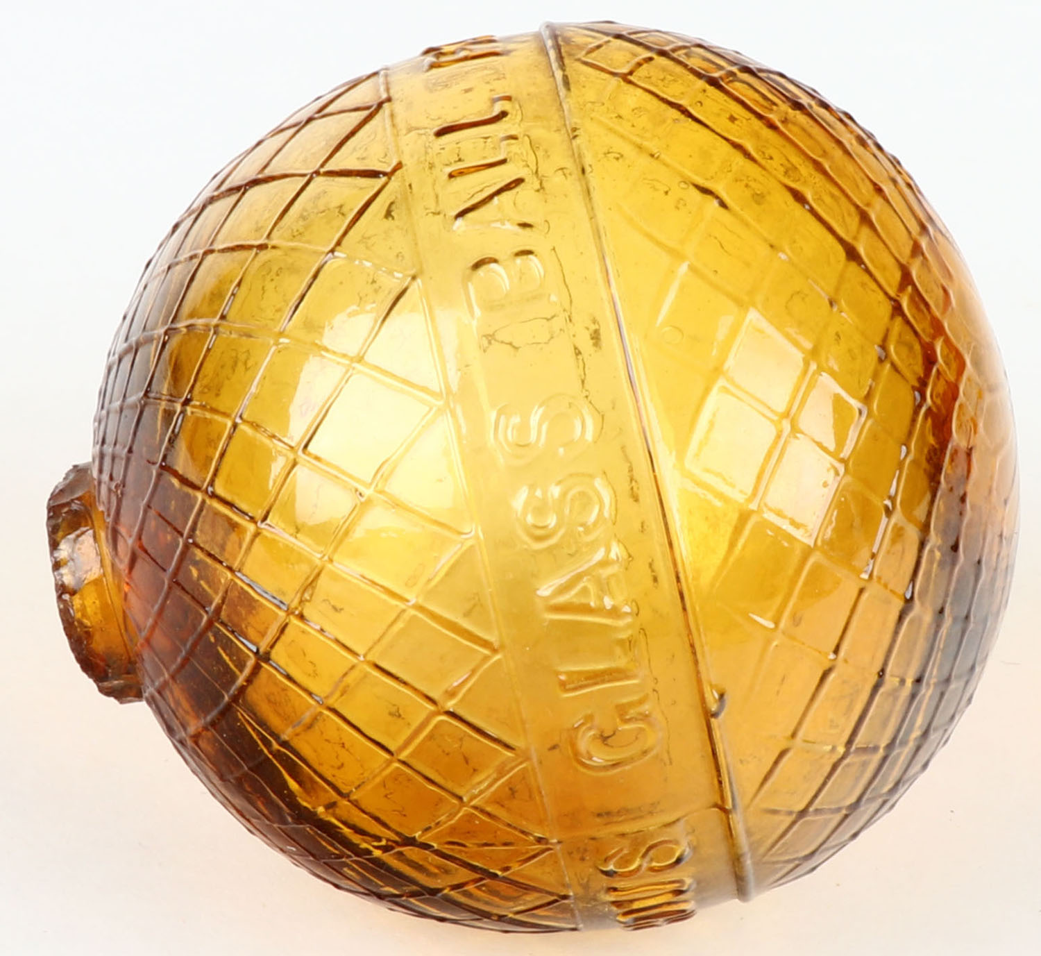 VERY RARE! Amber Bogardus Target Ball, Large A in Center Band, ''1877'', smooth design, 3 piece, short neck, wonderful condition. Grade: Excellent ++ - Value: 400 to 1000