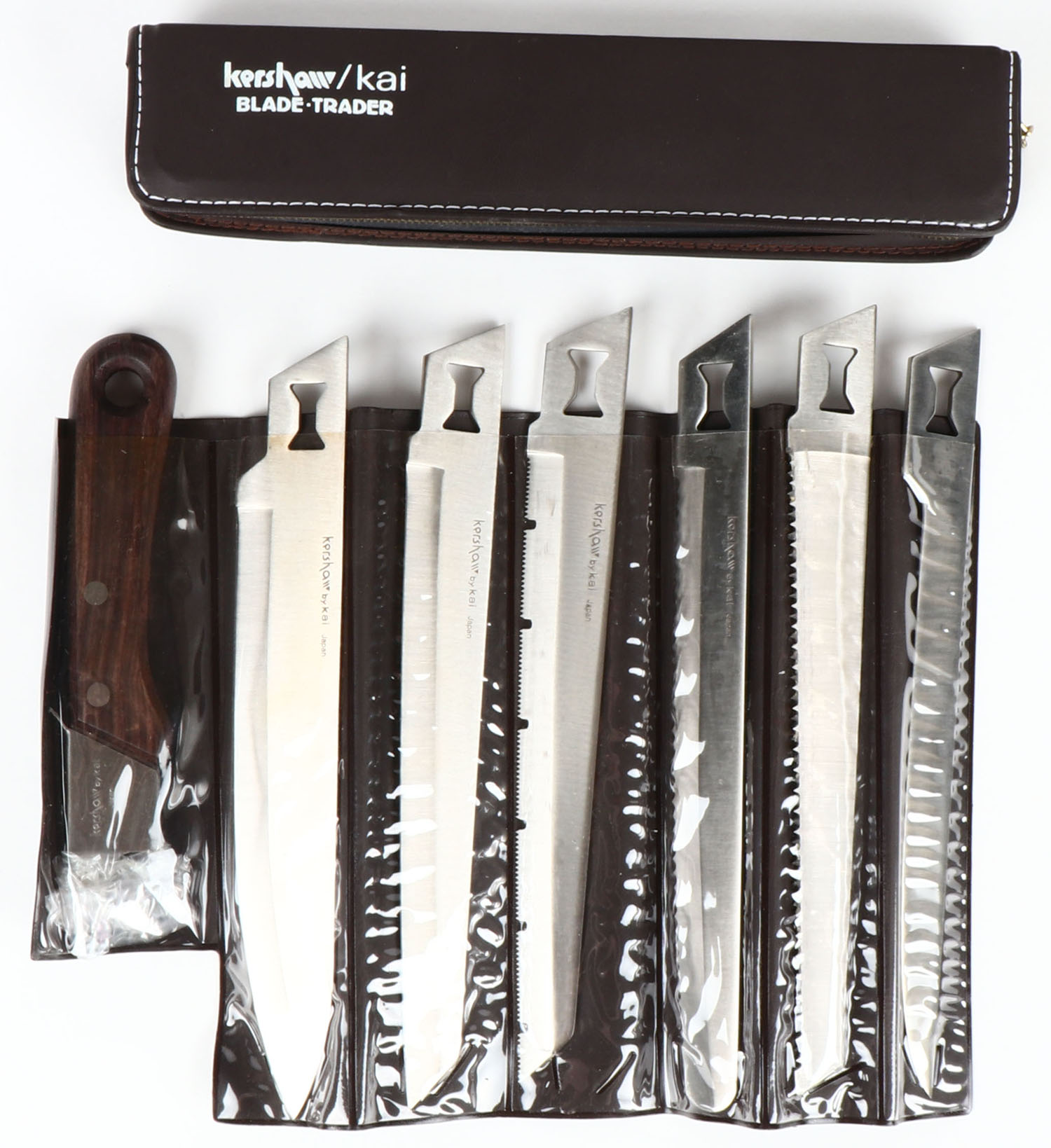 Kerhsaw/kai fixed blade knife, blade trader knife set, in soft carrying case, 5 blades all about 8''. Grade: Excellent ++ - Value: 50 to 100